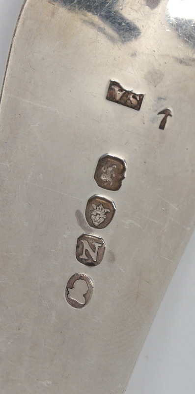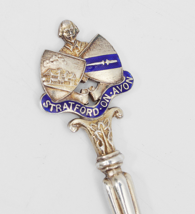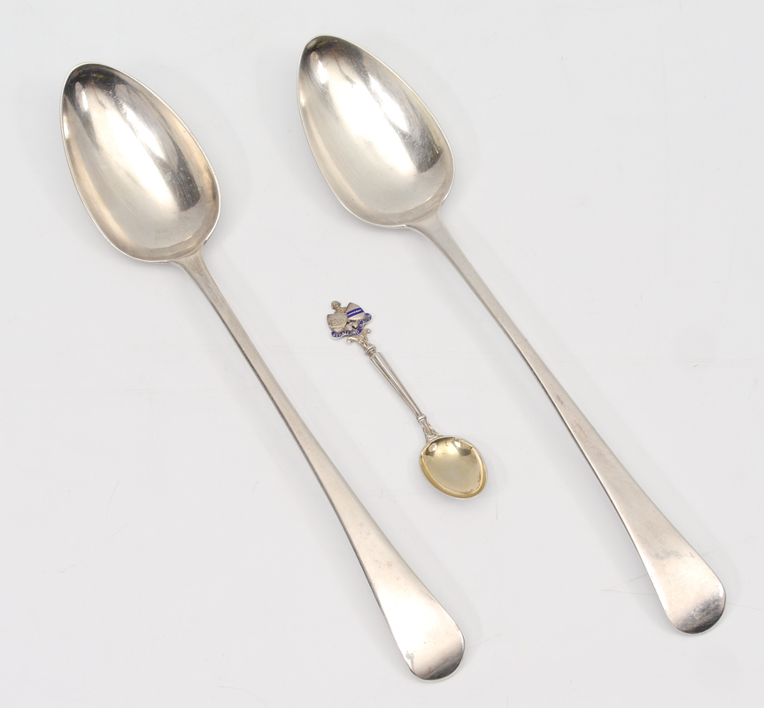 PAIR ENGLISH STERLING STUFFING SPOONS: 2 piece 1808, Stephen Adams, London hallmarked, 11 3/4'' long. Sold with a Sterling Stratford on Avon souvenir spoon. Approx. 7.2 troy oz.