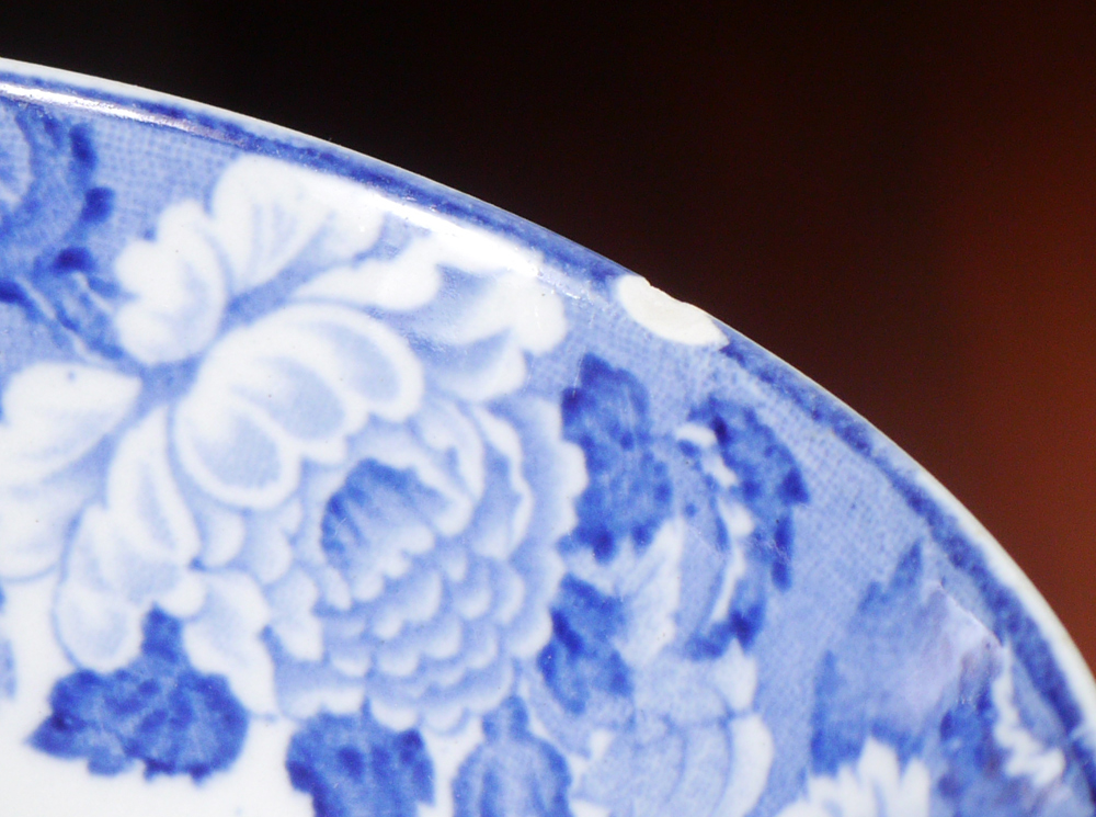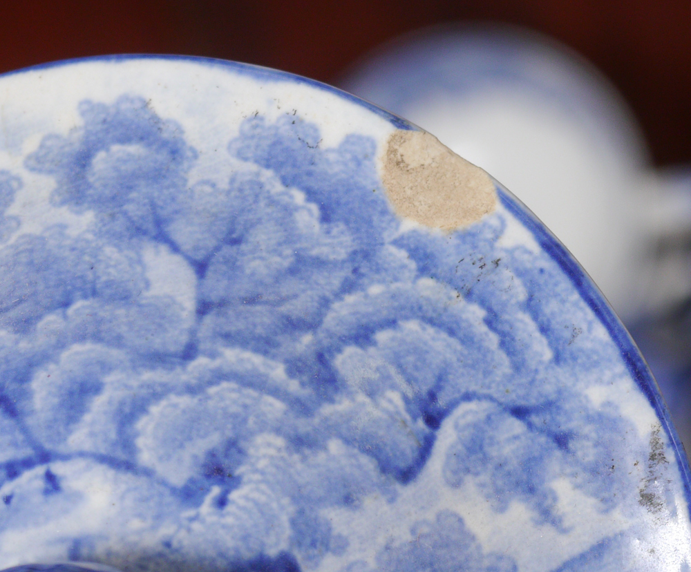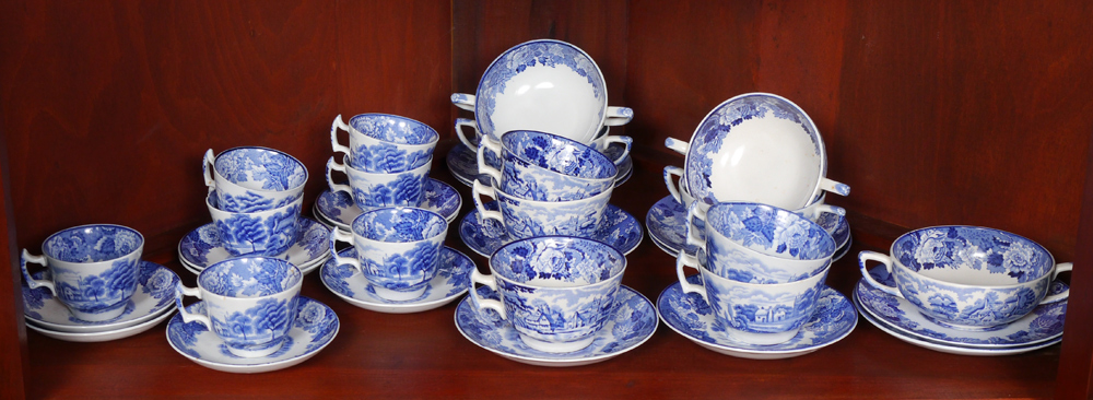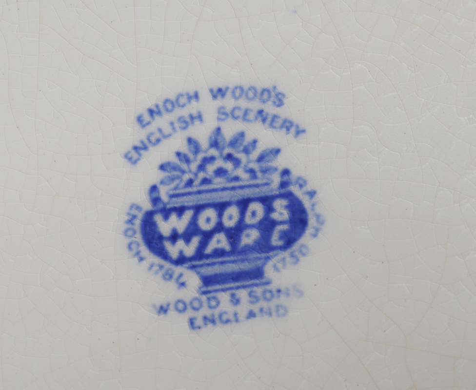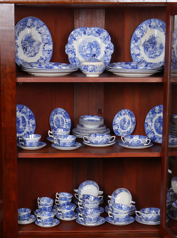 ENOCH WOODS ENGLISH SCENERY WOODS WARE: Blue transfer pattern in the English scenery design. Approx. 75 pieces to include 8 grill plates (10 3/4'' dia.), 8 salad plates, 8 bread plates, 5 dessert bowls, 7 cream soup with 8 underplates, 8 teacups with 6 saucers, 7 demi cups 8 saucers, a covered sugar (chip on lid), and a square cake plate.