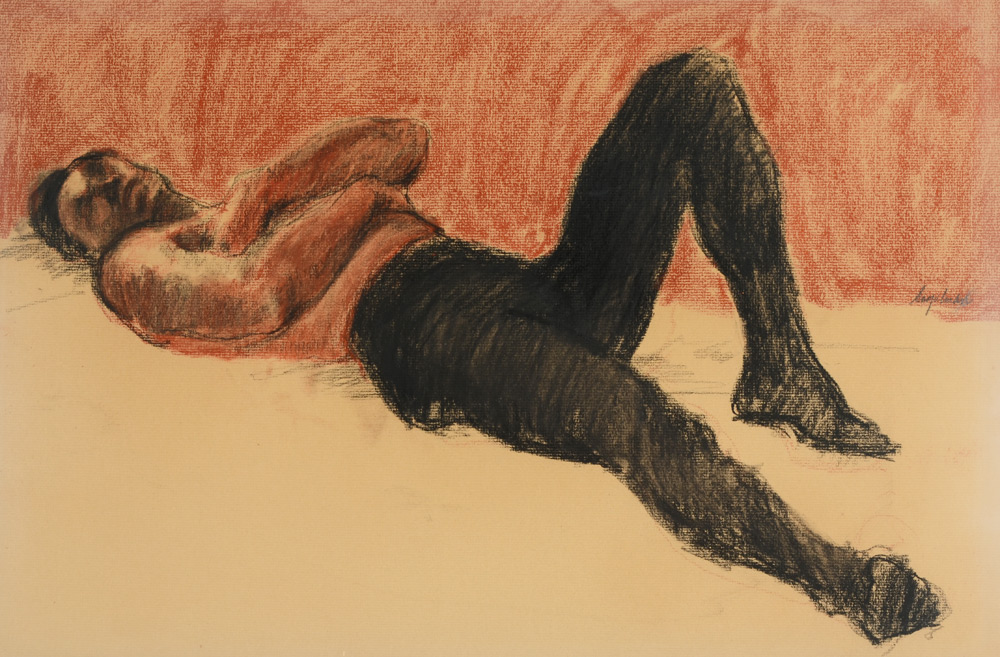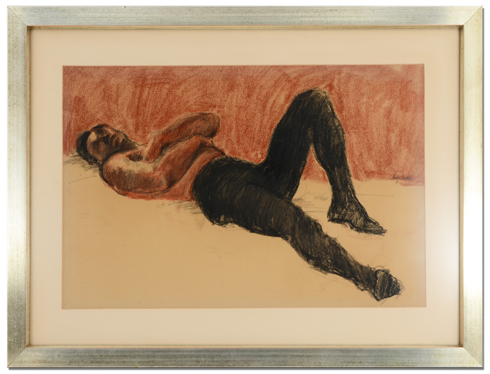 SEGALMAN, Richard, (American, 1934- ): Shirtless Reclining Man, Colored Drawing, Sight size 14 1/2'' x 22 1/4'', signed in the right margin, custom framing 22 1/4'' x 29 1/4''.