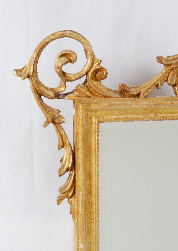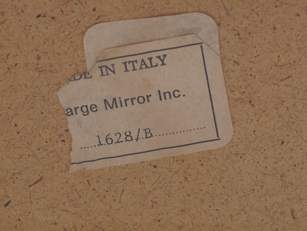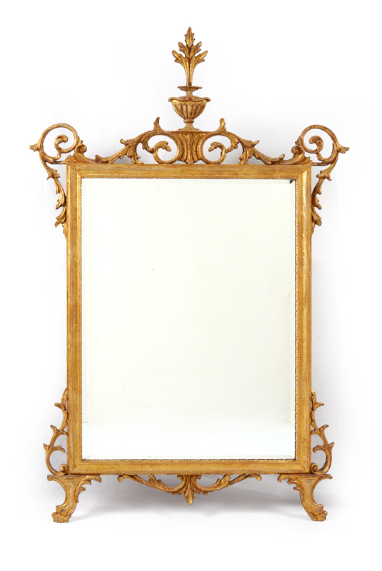 LABARGE ITALIAN GILT WOOD WALL MIRROR: Frame with urn finial and foliate scroll motif, beveled glass mirror, LaBarge label on back. Measures 51 1/2'' h. x 32'' x 1 3/4''.