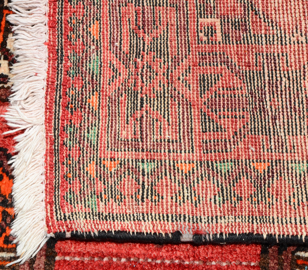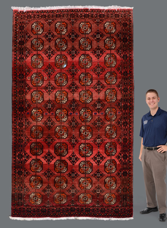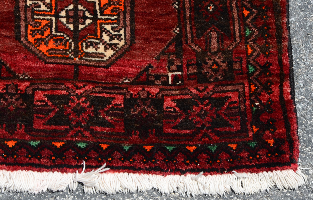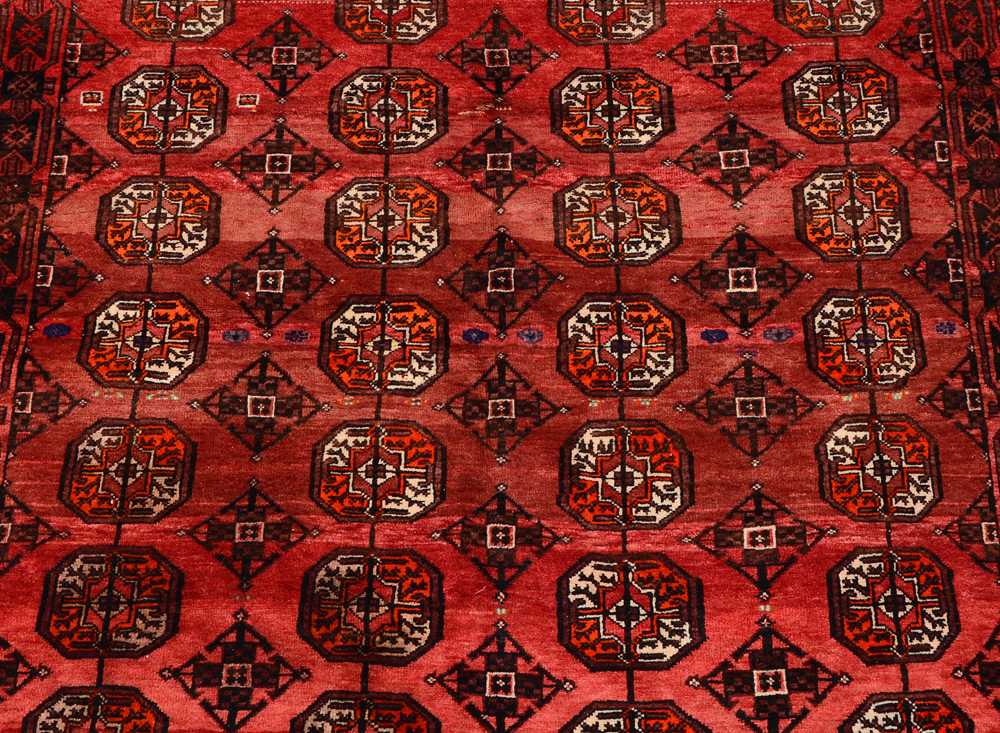 APPROX. 30-50 YR OLD BOKHARA HAND KNOTTED WOOL RUG, 7' 8'' x 9' 10'': This Bokhara rug has both traditional colors and design motifs of rugs woven in the Turkestan region. The brick and tomato reds outlined with black and lightened with accents of white are used to good advantage within the confines of the design. The staggered rows of elephant foot shaped ''guls'' and diamond shaped ''guls'' repeat over the whole field of the rug. The small borders are a little darker than the field to frame the rest of the rug. Condition is good.