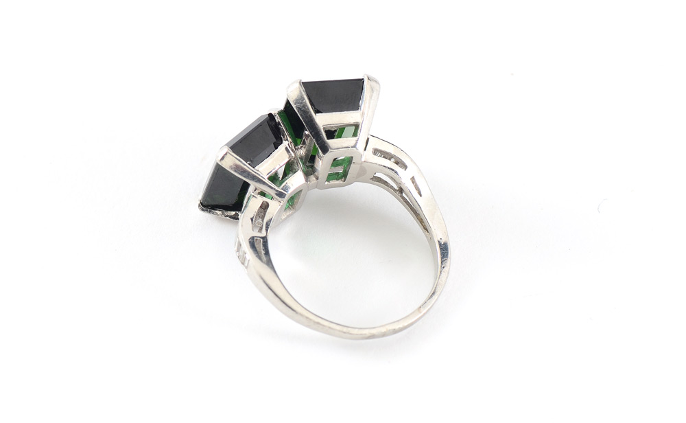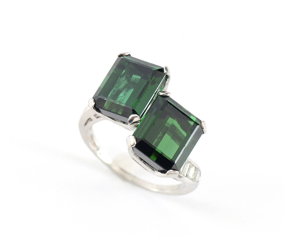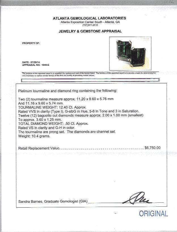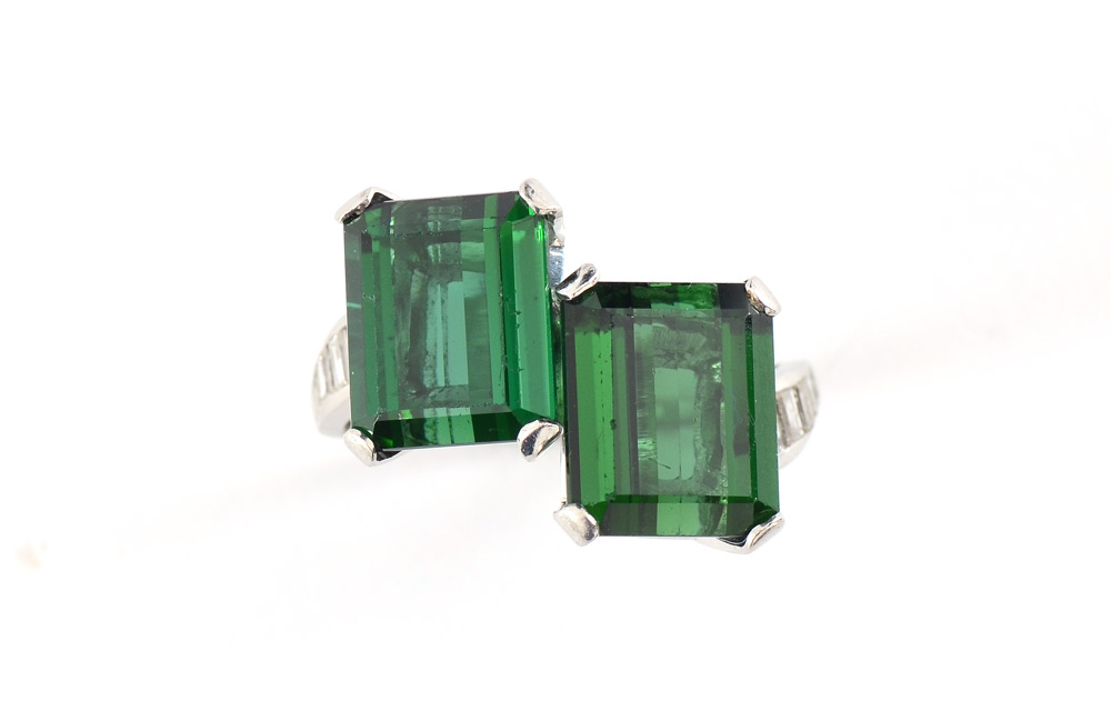 CA.1950'S PLATINUM TOURMALINE AND DIAMOND RING: Platinum ring featuring two large emerald cut green tourmaline ov VVS clarity, totaling approx. 12.40 Ct. The 12 baguette diamonds total approx. .50 Ct, average VS clarity and G-H color. Size 8.5. Weight 10.4 grams. Sold with current Atlanta Gemological GIA graduate's appraisal for $6,750.