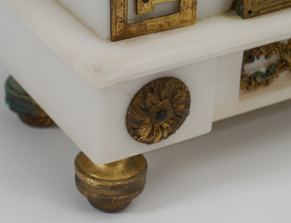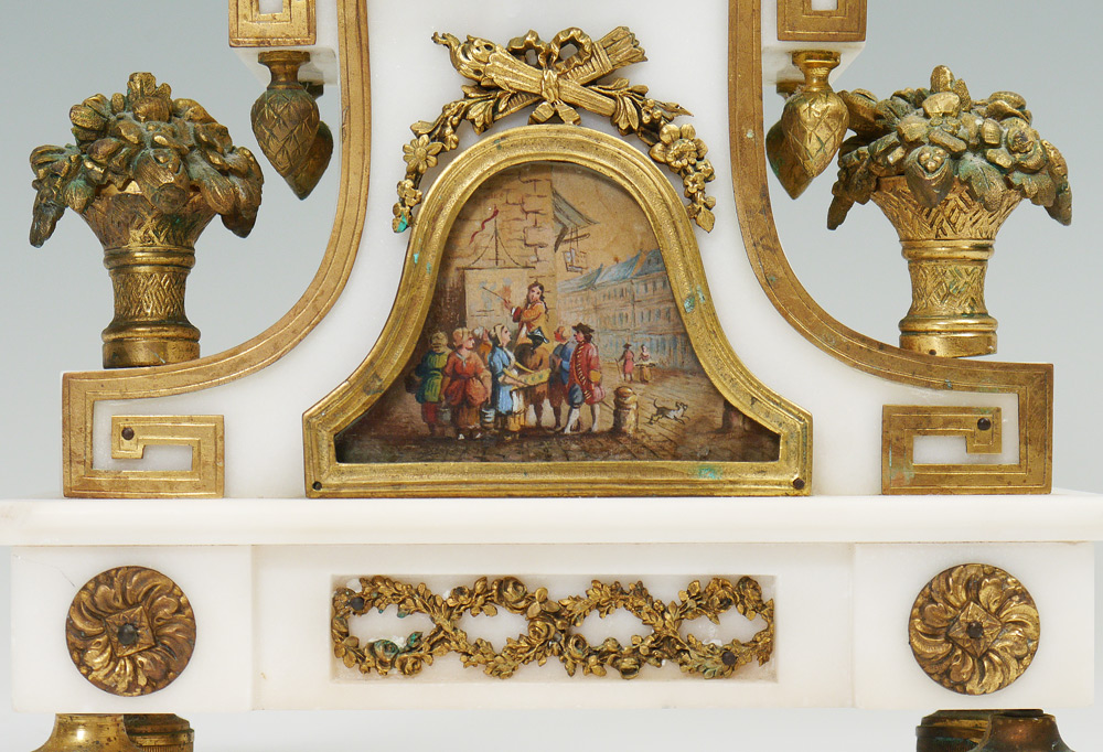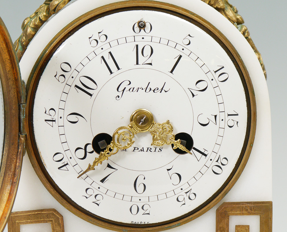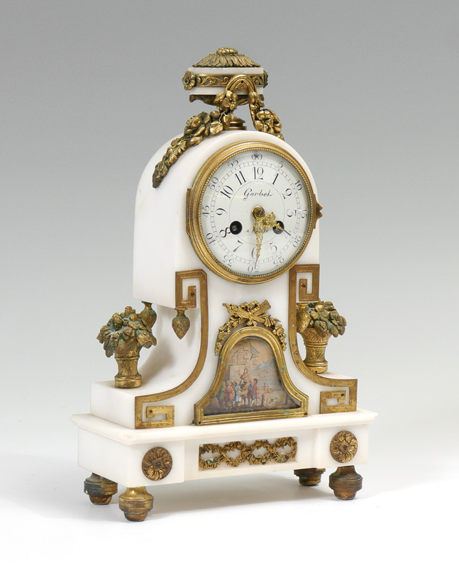 BRONZE MOUNTED FRENCH GARBEL MANTLE CLOCK: White marble case with gilt bronze mounted finial, floral swags and bouquets, inset hand painted Parisian street scene watercolor. Porcelain dial with Arabic numerals, marked Garbel a Paris. French marked time and strike movement. Overall measures 13'' h. x 8 3/4'' x 3 3/4''.