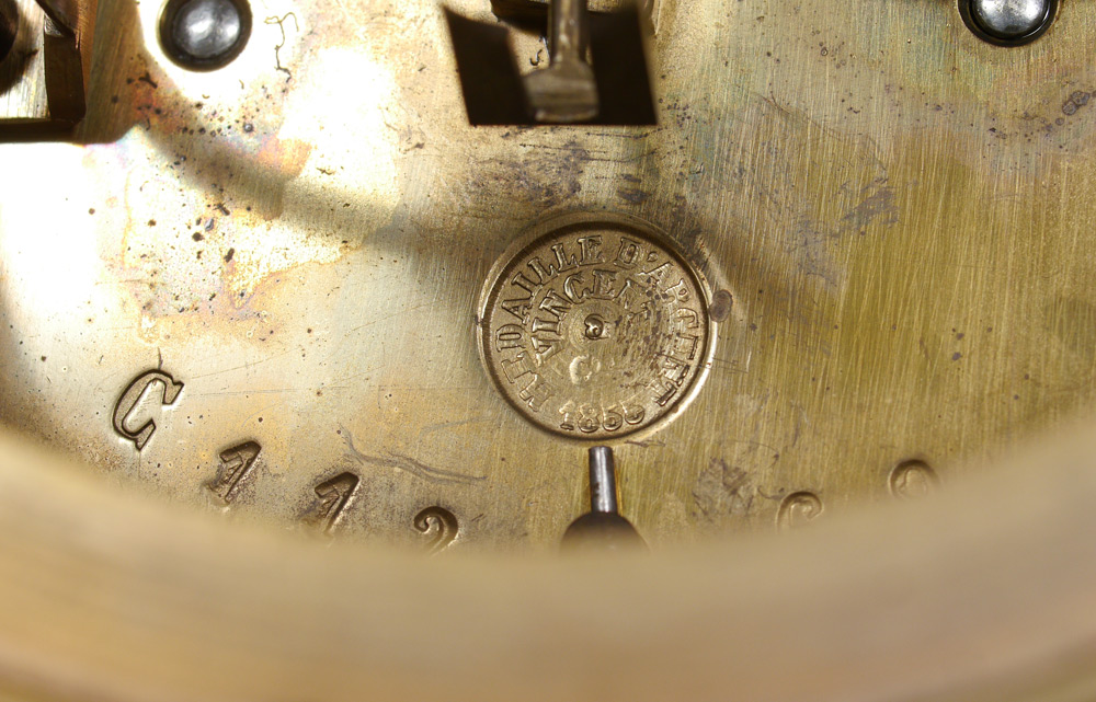 CONDITION: Chips to case, tarnish to mounts. Currently running however not guaranteed to continue or keep accurate time. Key and pendulum in office.