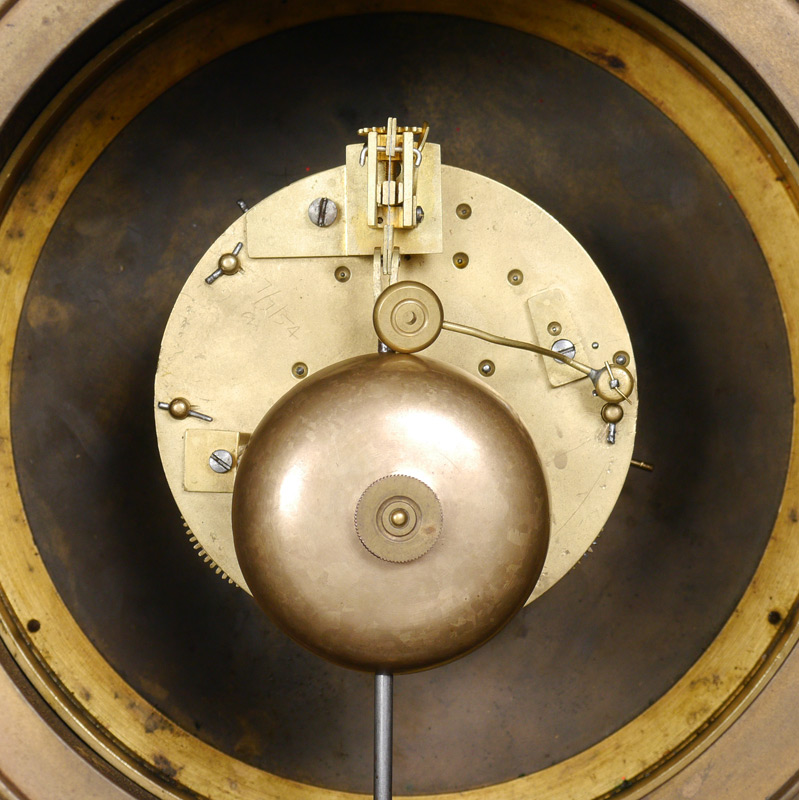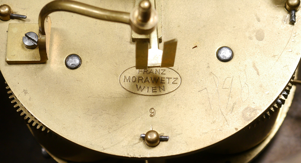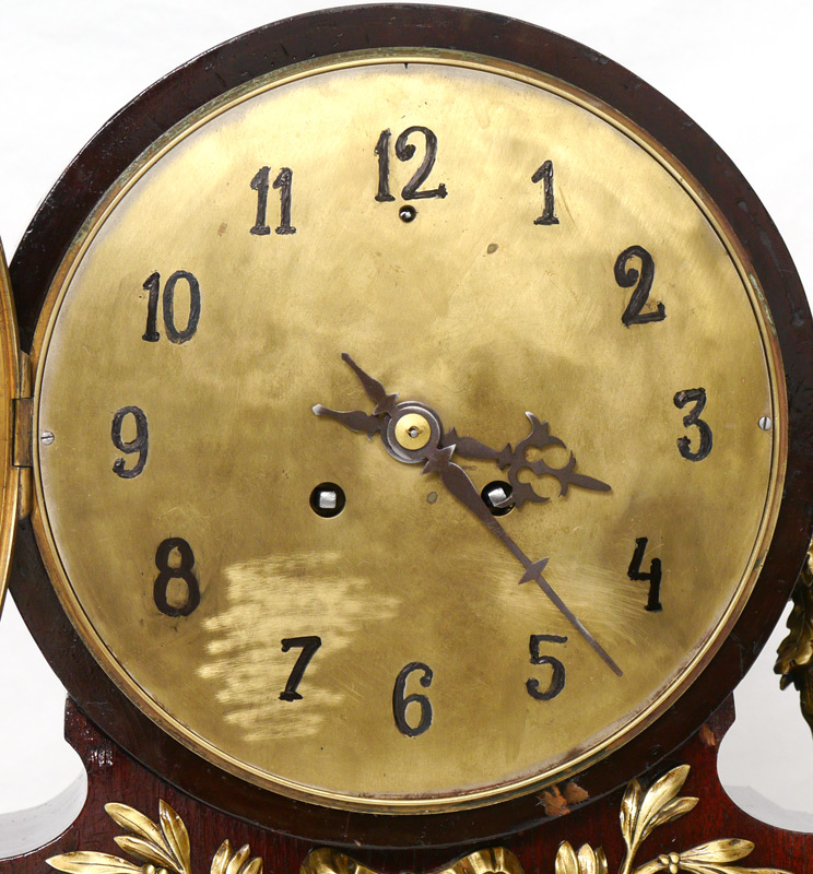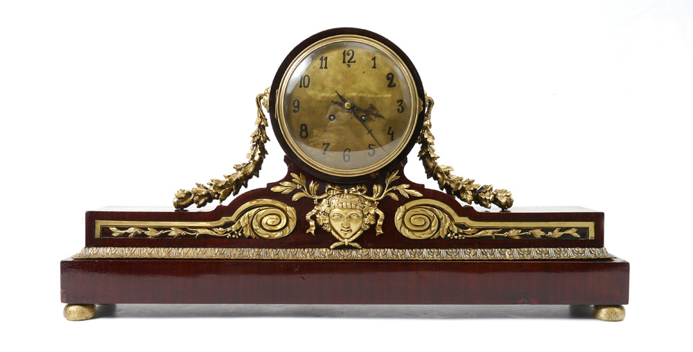 ORMOLU AND MAHOGANY CONTINENTAL MANTLE CLOCK: Mahogany veneer case and stand with applied gilt metal decoration including floral swags, masqueron and acanthus leaf trim, on 4 gilt metal feet. Brass dial with painted Arabic numerals, Vienna Franz Morawetz time and strike movement. Overall measures 24 1/4'' h. x 27 1/2'' x 5 1/2''