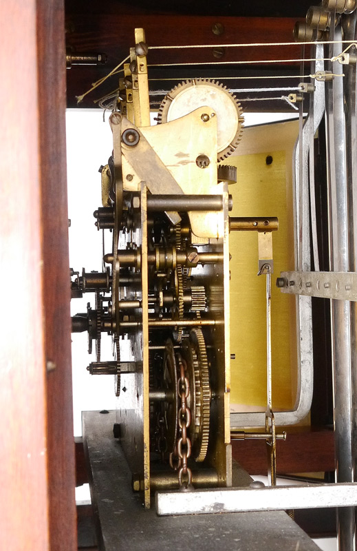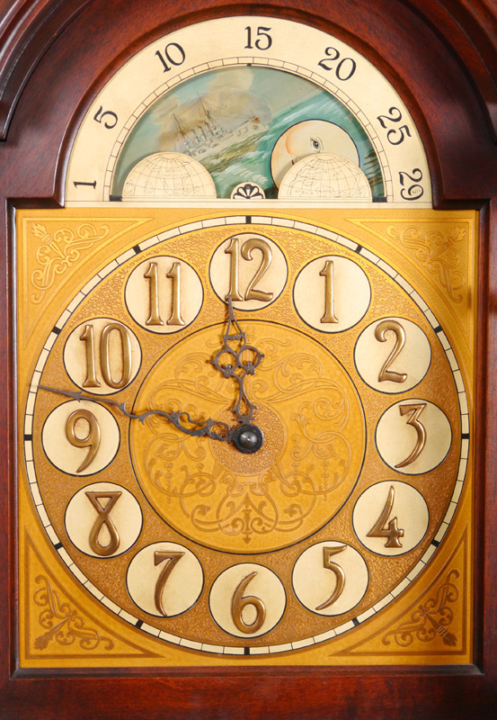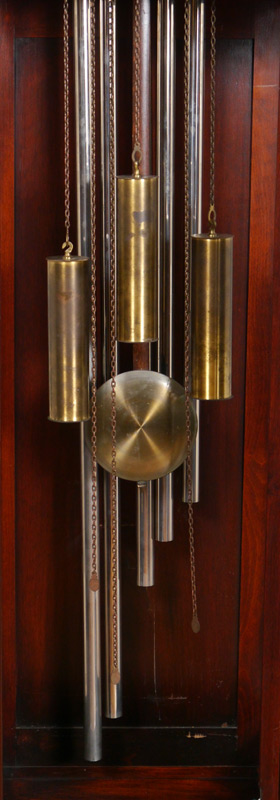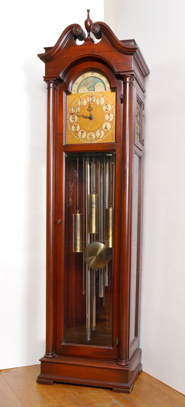 MAHOGANY COLONIAL 5 TUBE TALL CASE CLOCK: Broken arch pediment with spire finial, full column stiles. Mixed metal dial with moon phase and applied Arabic numerals. Weight driven movement marked Colonial Mfg. Co., 5 tube chime. Overall measures 83'' h. x 22 1/2'' x 16 1/4''