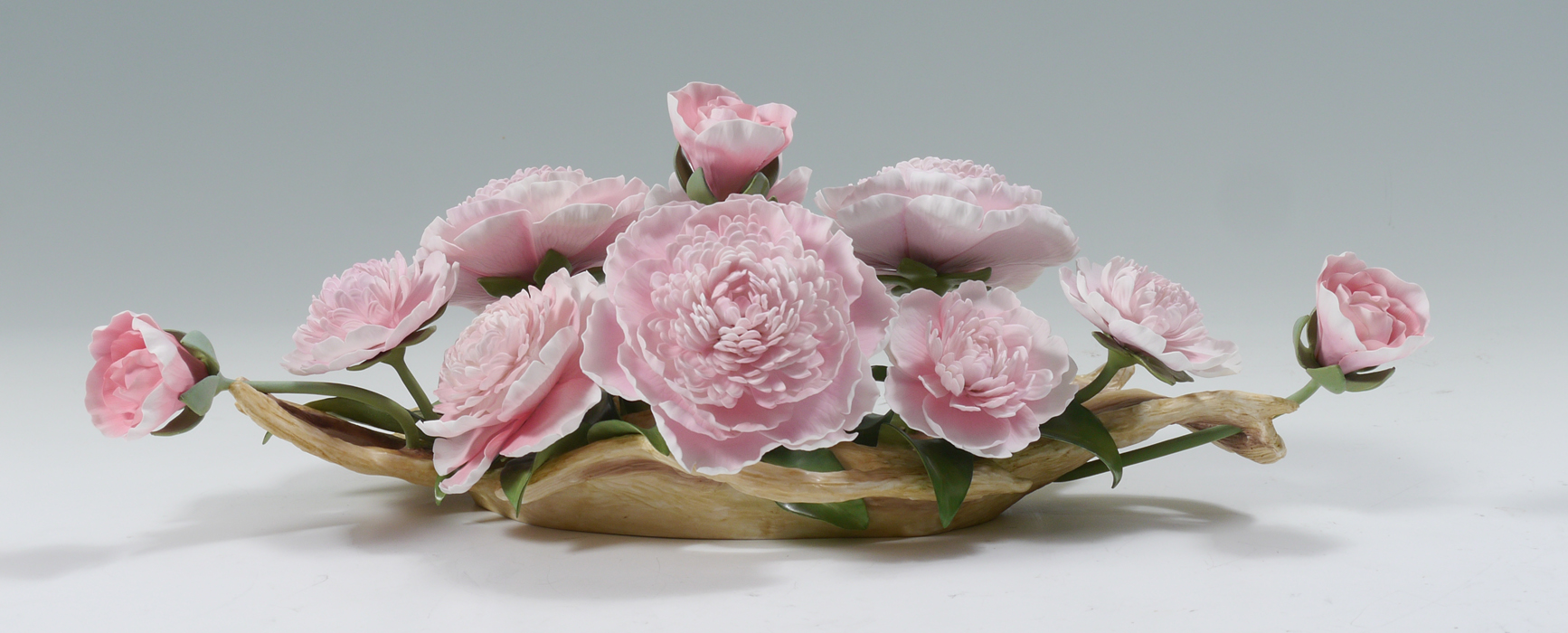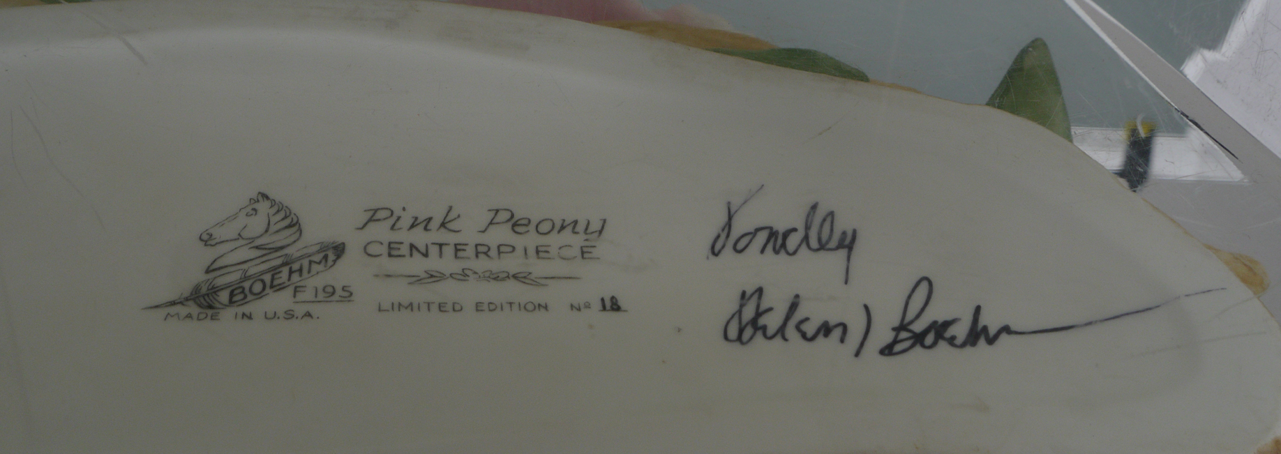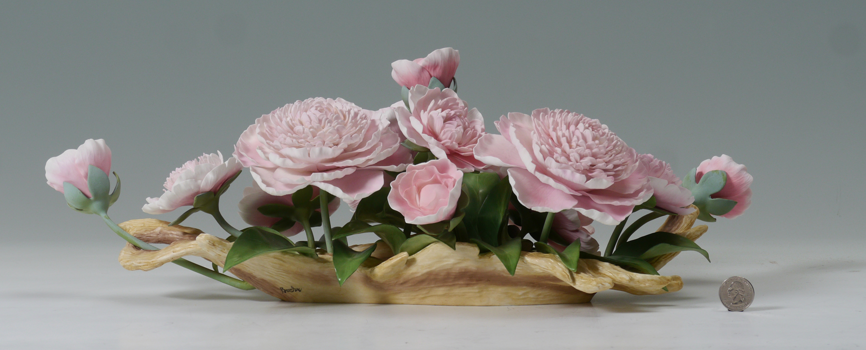 BOEHM PINK PEONY FLORAL CENTERPIECE F195: Limited edition number 18, signed ''Fondly, Helen Boehm''. 7''h x 21''. Helen Boehm, (1920-2010) played a pivotal role in promoting the ceramic sculptures created by her husband Edward Marshall Boehm, earning her the nickname the ''Princess of Porcelain''. A luncheon invitation from First Lady Mamie Eisenhower helped make Boehm's designs a standard gift from U.S. Presidents to foreign dignitaries.