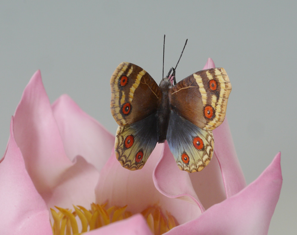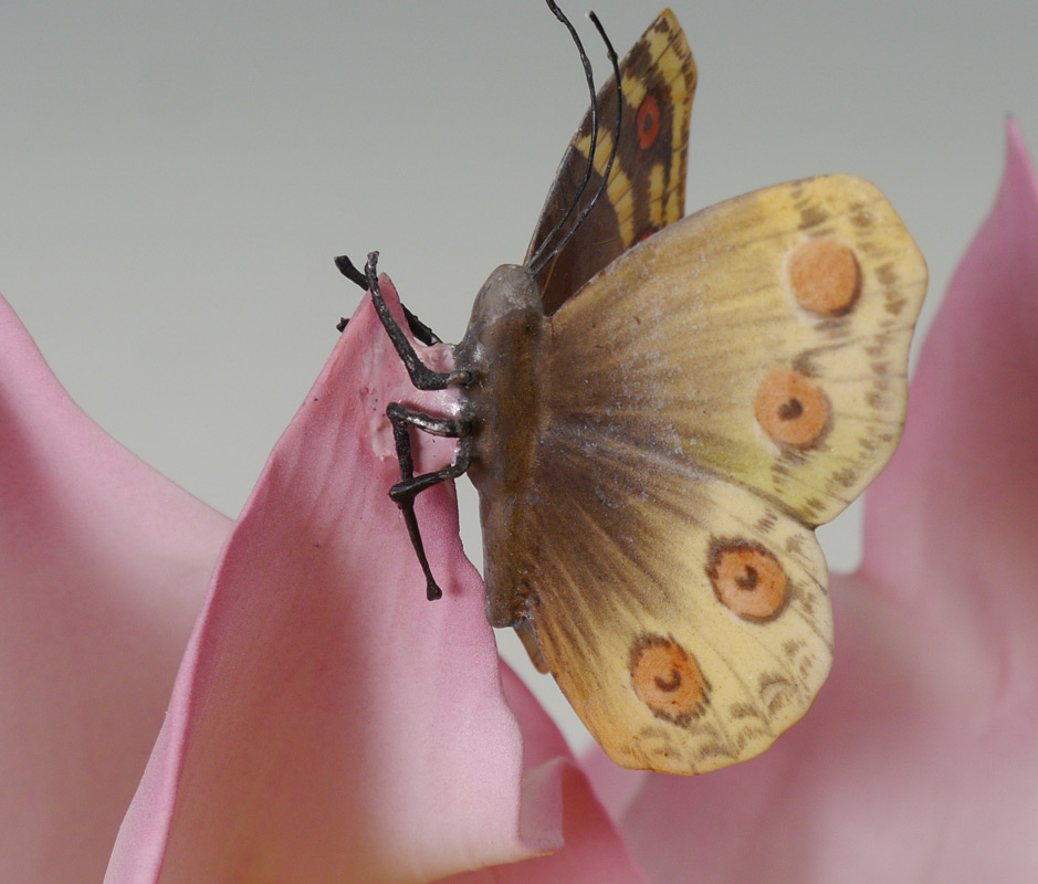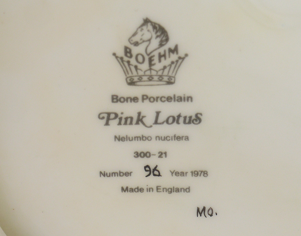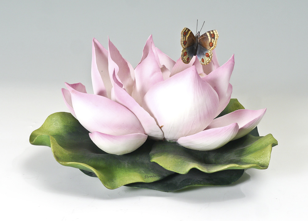 BOEHM PORCELAIN ''PINK LOTUS'' FLORAL SCULPTURE: Large pink lotus flower with butterfly, #96, 6'' tall x 10 1/2'' dia.