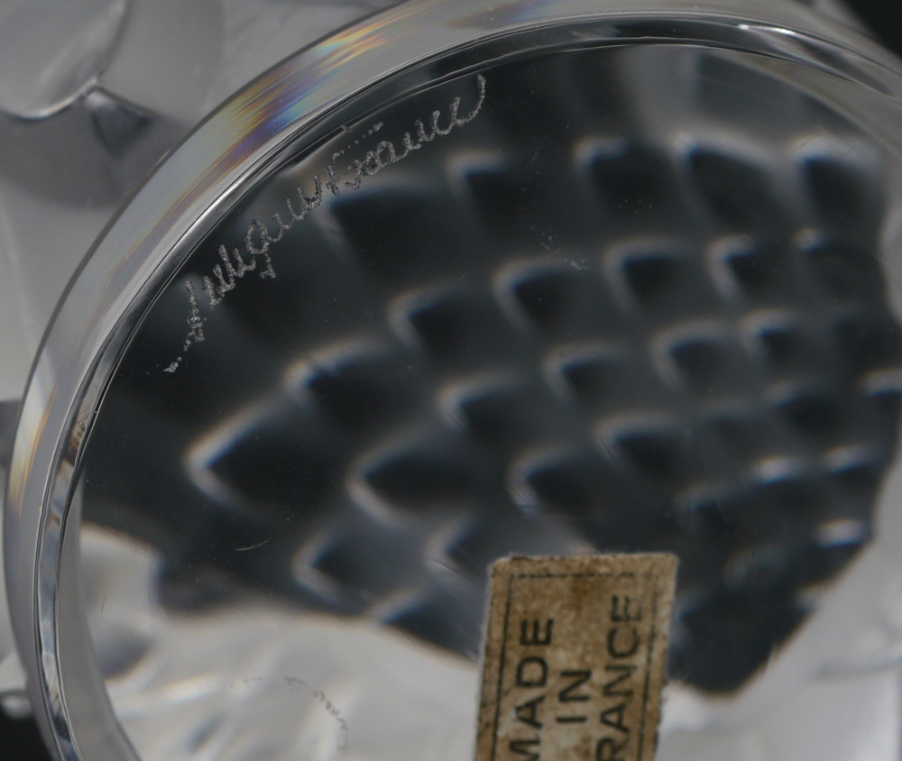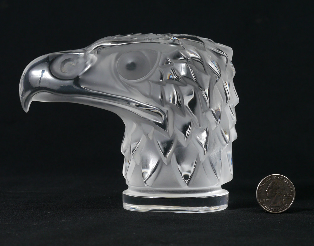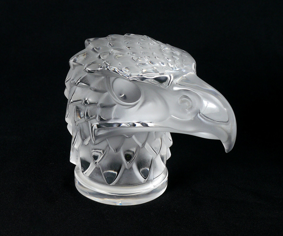 LALIQUE FRENCH CRYSTAL EAGLE HEAD CAR MASCOT: ''Tete d' Aigle'' Signed Lalique France and Made in France paper label. Measures approx. 4 1/2'' tall x 6''.