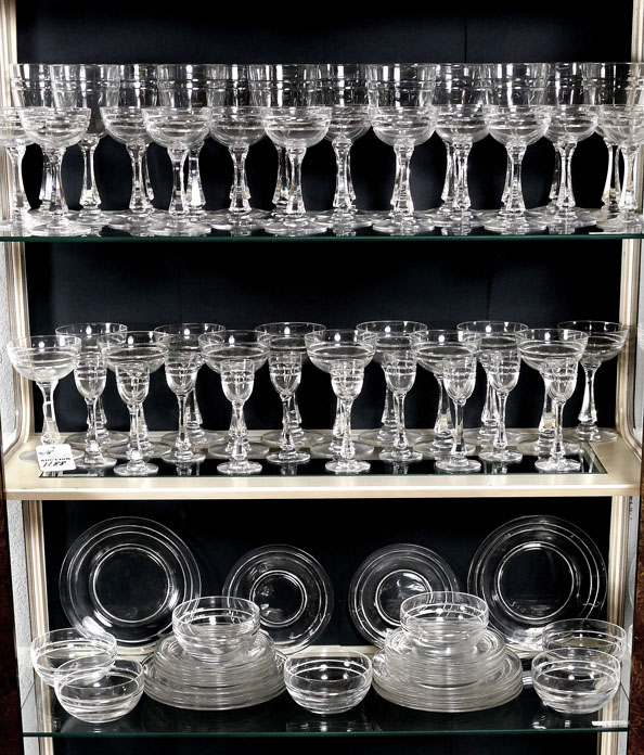 SIGNED HAWKES DRUID CRYSTAL SERVICE: Approx. 70 pieces in the Druid pattern by Hawkes to include 12 water glasses (7 3/8''), 12 champagne (5 5/8''), 12 sherbet (5 5/8''), 10 cordial (5 3/8''), 8 dessert plates (8'' dia), 8 bread plates (6 1/4''), 8 bowls (4 5/8'').