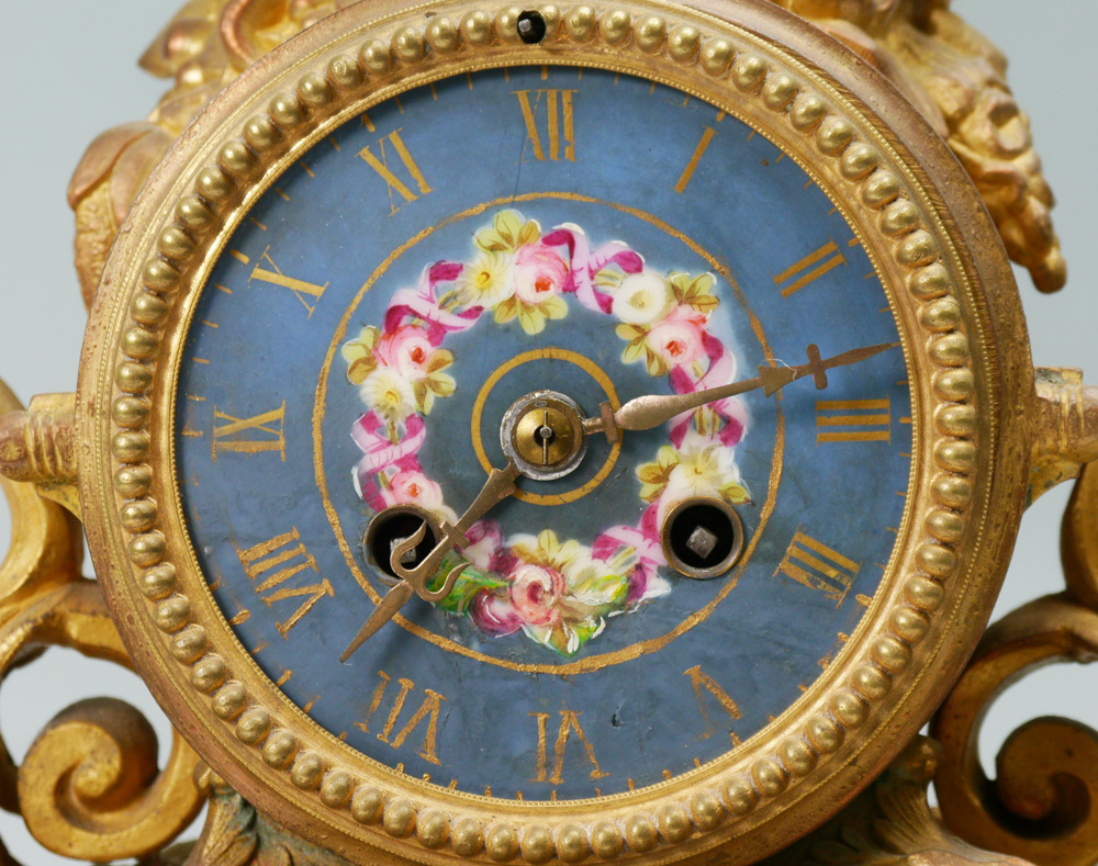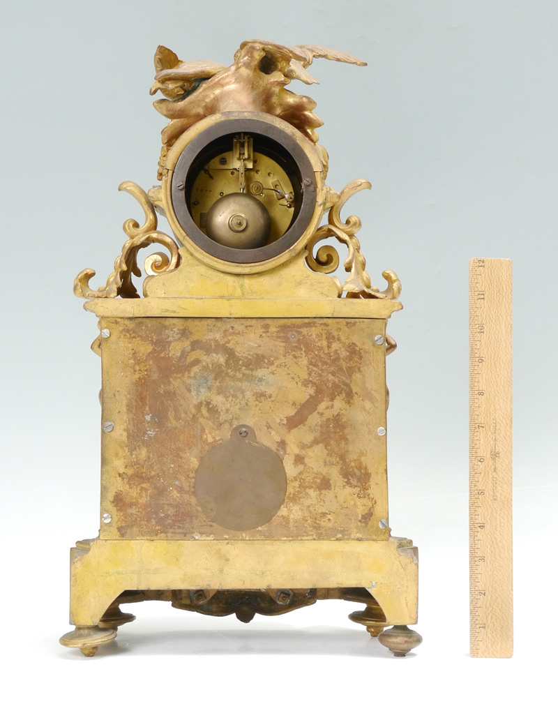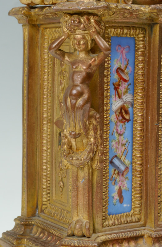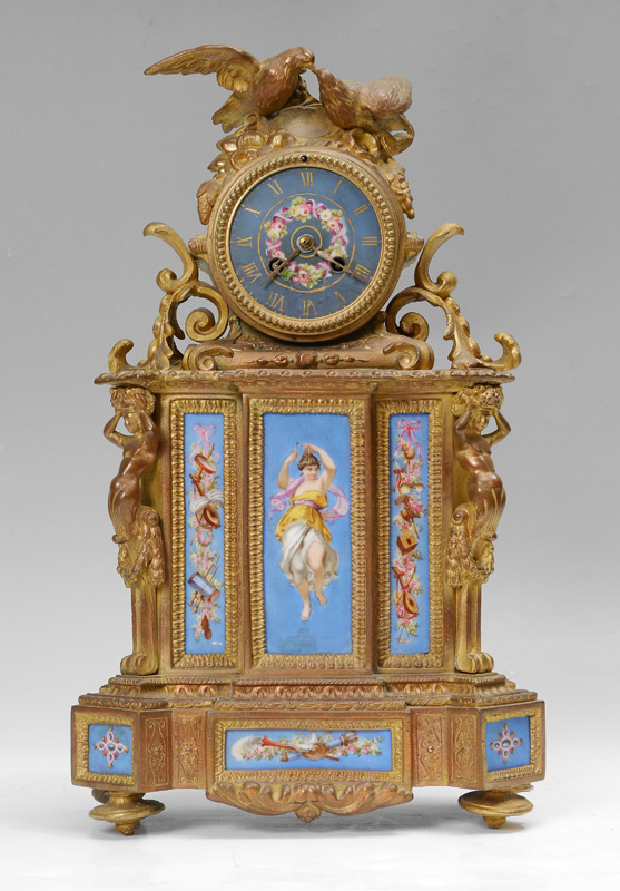 FRENCH FIGURAL GILT METAL MANTLE CLOCK: Gilt metal case, finial with figural doves, dial surmounted by foliate scroll over body with figural maiden, shaped base on 4 feet. Porcelain dial with hand painted floral ring, gilt Roman numerals. Body with 6 hand painted porcelain inserts featuring musician, musical instruments and floral decoration. Japy Freres French time and strike movement. 19'' h. x 11 1/4'' x 5''.