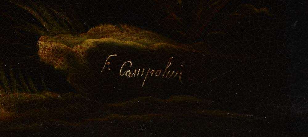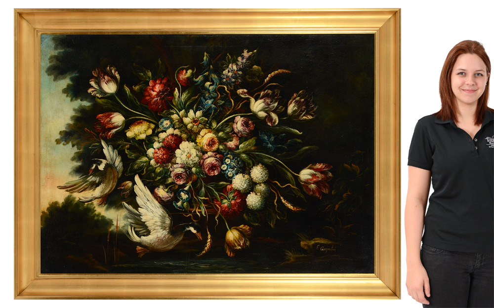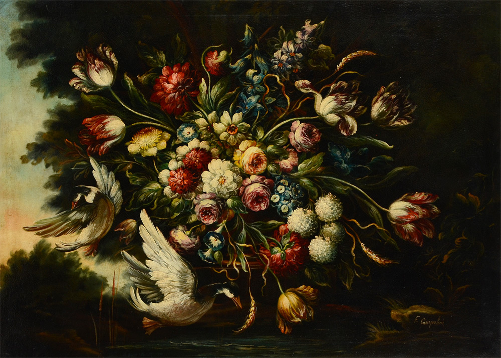 LARGE NEOCLASSICAL STYLE DECORATIVE STILL LIFE PAINTING: Signed lower right F. Campolini, Oil/Canvas, 39 1/4'' x 55'', encased in contemporary gold frame 47'' x 62''.