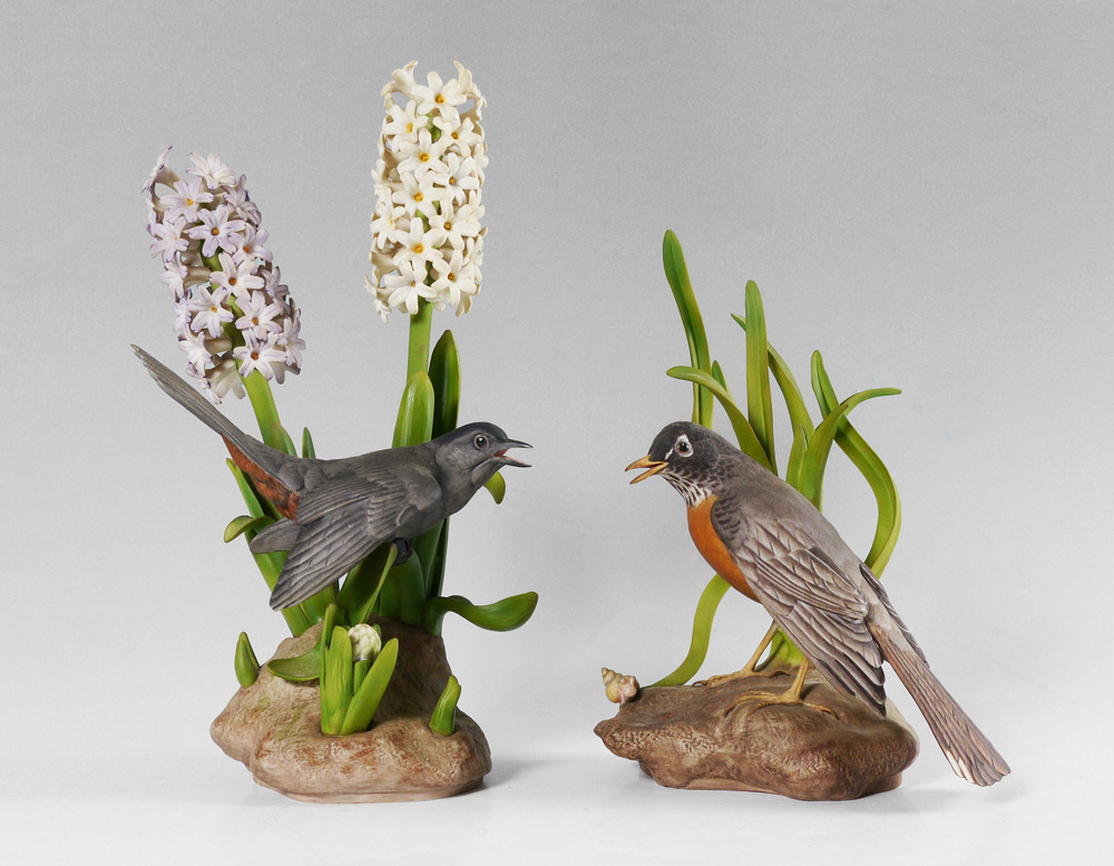 2 PIECE BOEHM PORCELAIN BIRD FIGURES: 1) Robin #472, 11'' tall. 2) Catbird #483, 14 1/2'' tall. Limited Edition, made in USA.