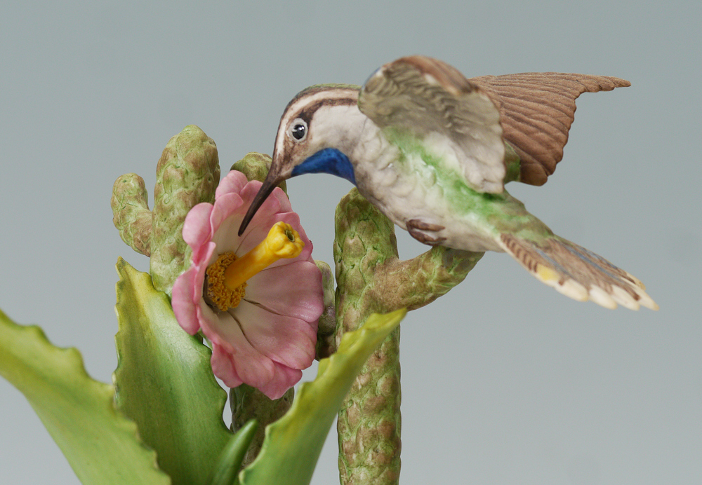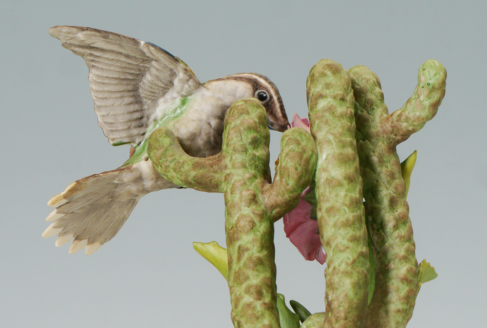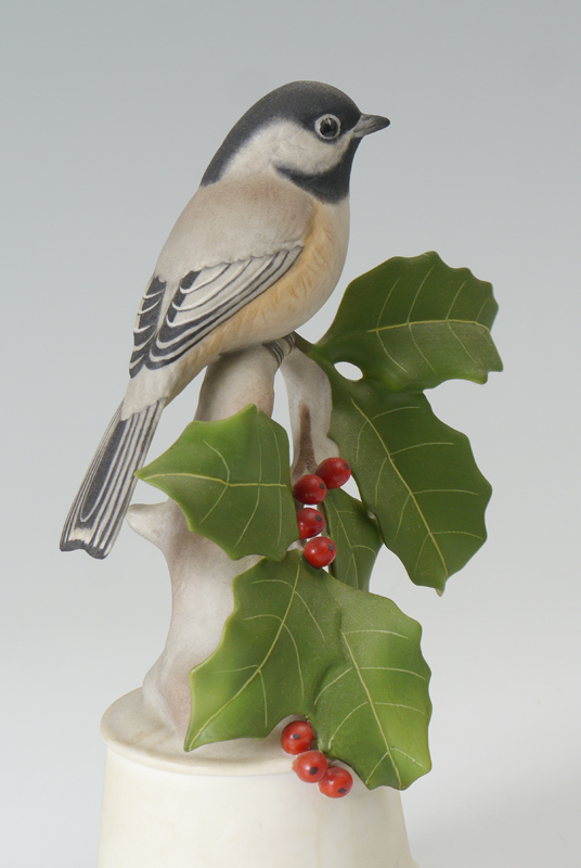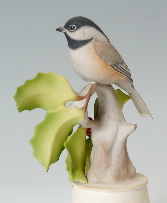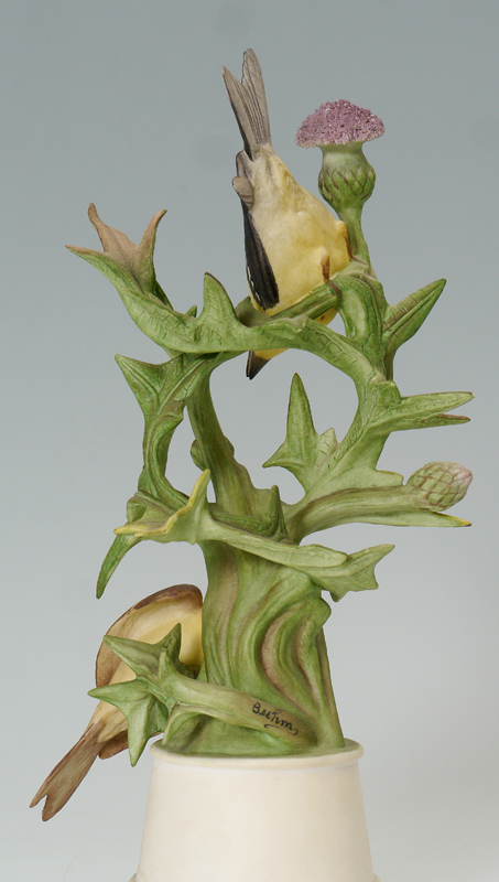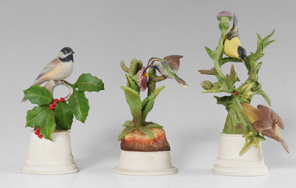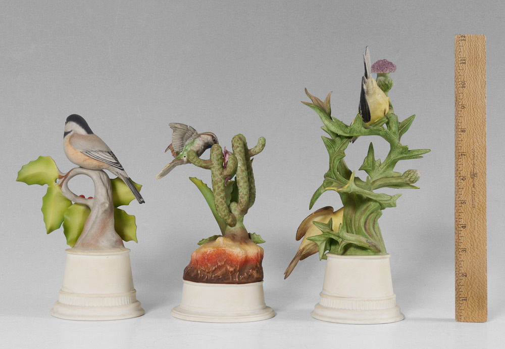 GROUP OF 3 BOEHM PORCELAIN BIRDS: 1) Limited edition Goldfinches, #457, 11'' tall. 2) Hummingbird, #440, 8 1/4'' tall. 3) Black Capped Chickadee #458, 8 3/4'' tall. All three are made in the USA.