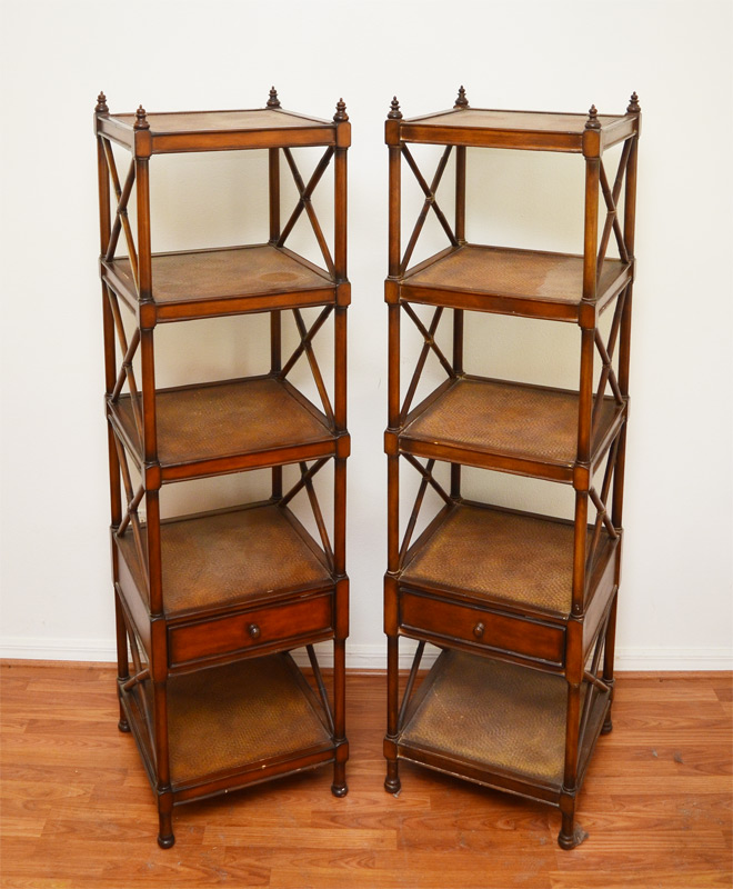 PAIR THOMASVILLE HEMINGWAY DISPLAY STANDS: 2 open display stands from the Ernest Hemingway Collection with 4 open shelves and single drawer. Thomasville plaque inside drawer. Measures 68'' h. x 20'' x 20''.