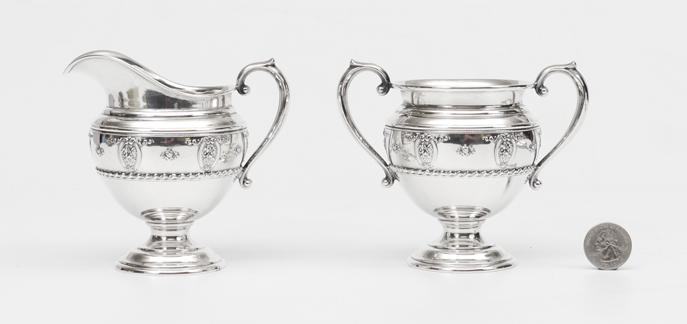 WALLACE ROSE POINT STERLING CREAMER, SUGAR, & TRAY: 3 pieces total in the Rose Point pattern by Wallace to include open creamer (4 1/4'' h. x 7 5/8''), open sugar (4'' h. x 5''), tray (10 1/2'' x 5 1/2''). Approx. 12.8 troy oz.