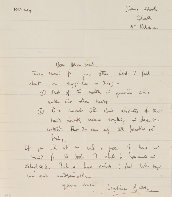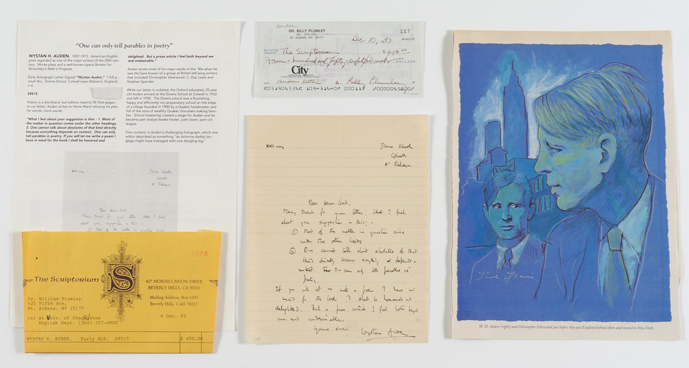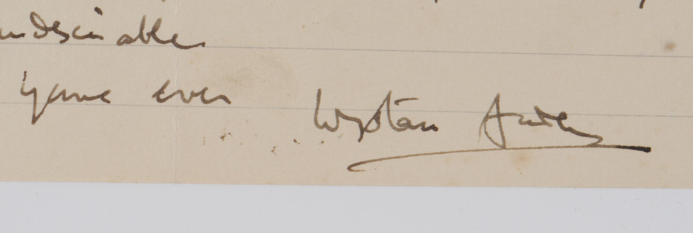 AUDEN, Wystan H. (Anglo-American, 1907-1973): A. L. S., undated, from his time at the Downs School in Cornwall, circa 1932-1935, to Heine Ward. Reads ''Many thanks for your letter. What I feel about your suggestion is this: - 1) Most of the matter in question comes under the other headings. 2) On cannot talk about absolutes of that kind directly because everything depends on context. One can only tell parables in poetry. If you will let me write a poem I have in mind for the book I shall be honored and delighted. But a prose article I feel both beyond me and undesirable. Yours ever, Wystan Auden''. Purchased from the Scriptorium in 1993, with accompanying paperwork, 8'' x 6 1/4''.