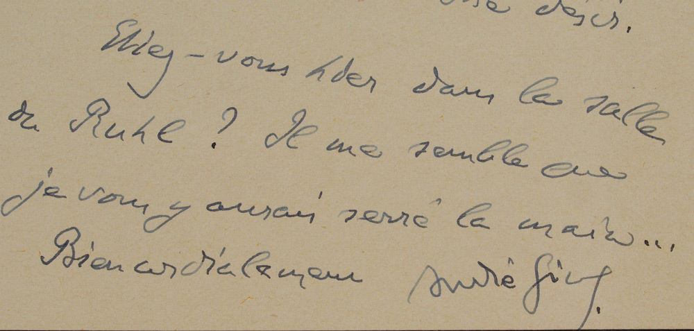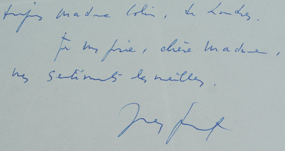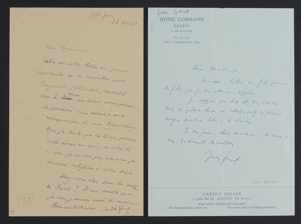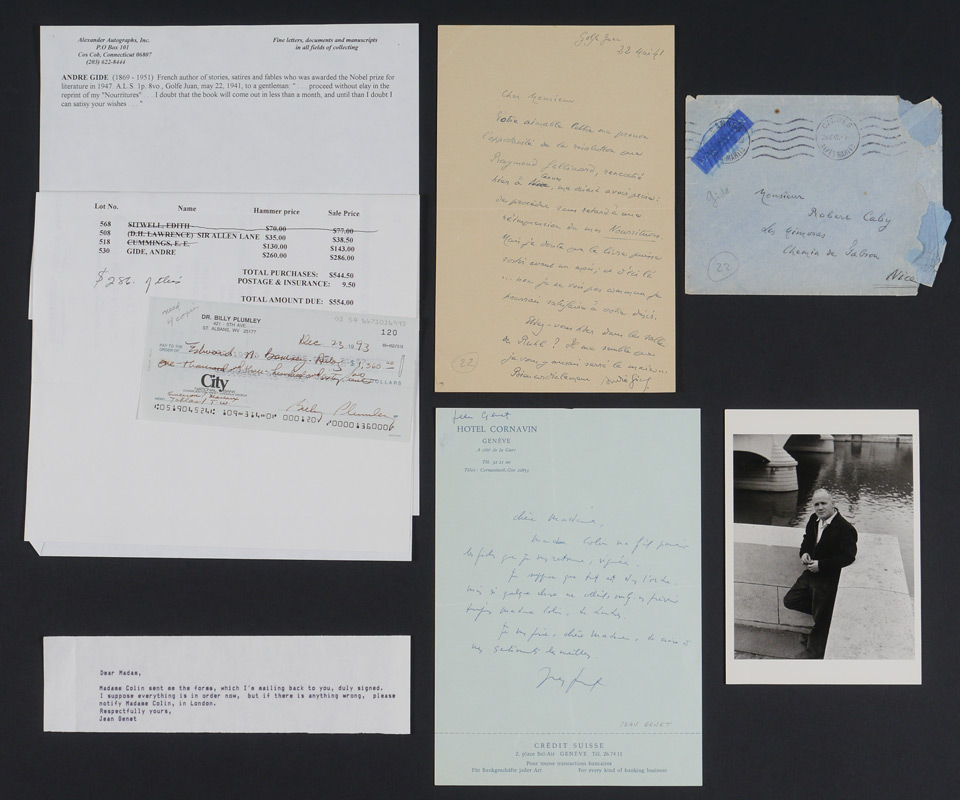 GENET, Jean (French, 1910-1986) & GIDE, Andre (French, 1869-1951): 2 A. L. S. to include 1) Nobel Prize winner Andre Gide, dated 1941, untranslated from original French, with references to a reprint of his book Nourritures. 8 1/4'' x 5 1/4''. 2) Novelist and activist Jean Genet, undated, on Hotel Cornavin letterhead, translated for the original French ''Dear Madam, Madame Colin sent me the forms, which I'm mailing back to you, duly signed. I suppose everything is in order now, but if there is anything wrong, please notify Madame Colin, in London. Respectfully Yours, Jean Genet. 8 1/4'' x 5 3/4''.