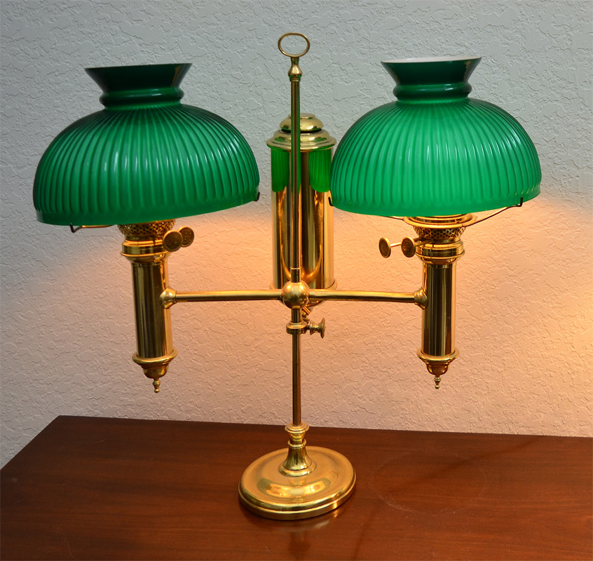 E. J. DEWEY DOUBLE FONT STUDENT LAMP: Electrified, brass double font base with E. J. Dewey Duplex New York marked knobs, 21 1/2'' h. x 19 1/4'' x 7''. Dual cased ribbed green glass shades 6'' h. x 10'' dia.
