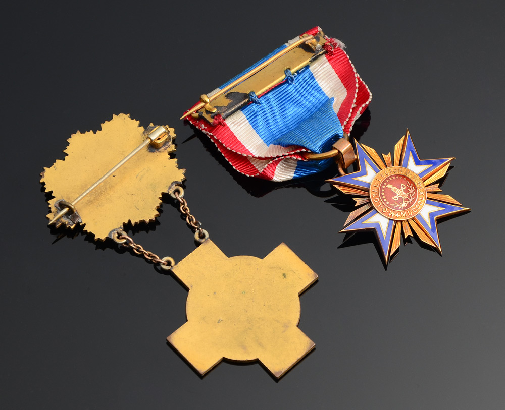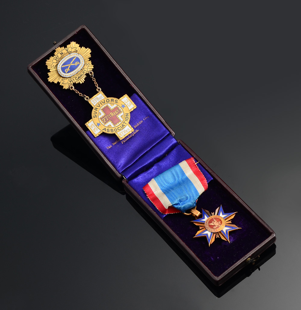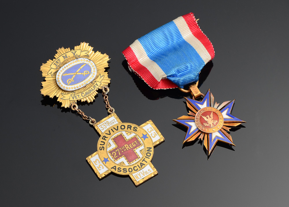 2 CIVIL WAR VETERANS MEDALS: 2 pieces total to include 1) Loyal Legion pin back ribbon and medal, numbered 10886, 2 3/4'' long. 2) Survivors Association with markings for 1st NY Vet. Cavalry, 33rd Regt. and 27th Regt. NY Vols., 3'' long. Sold with a Bailey, Banks & Biddle Co. felt lined box.