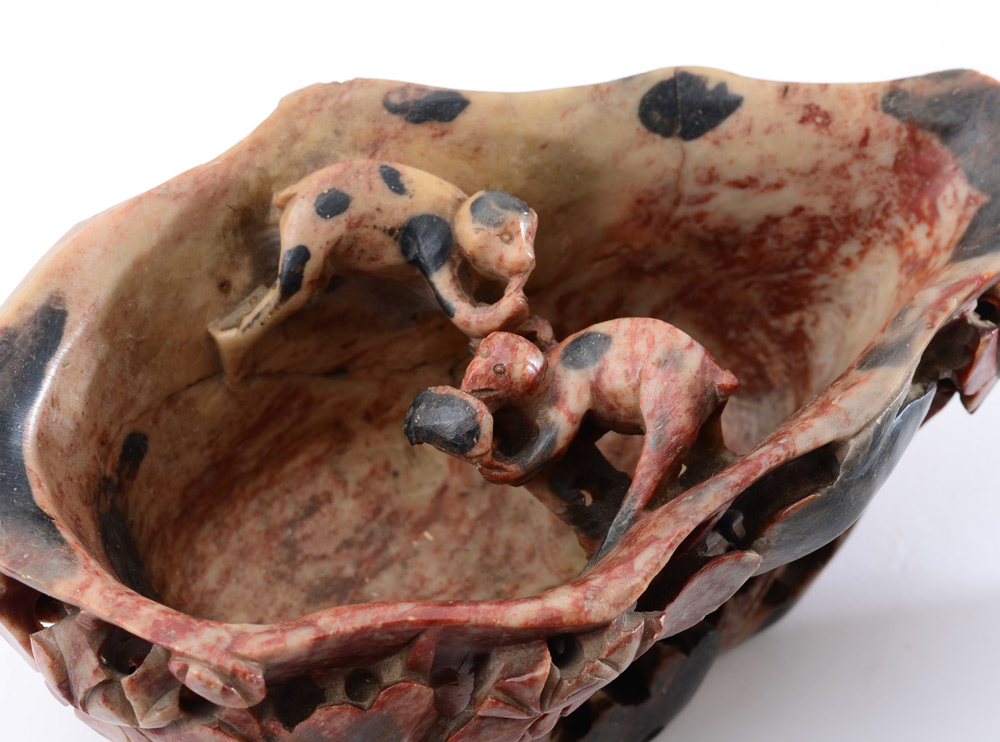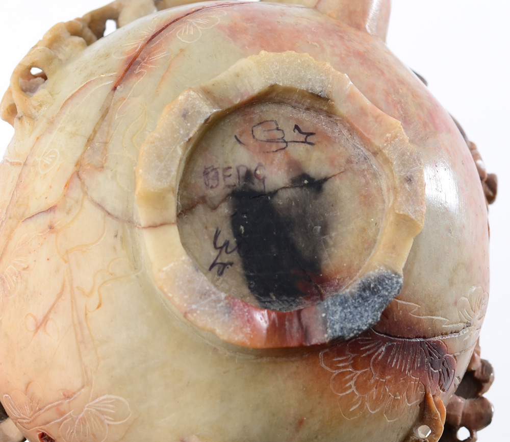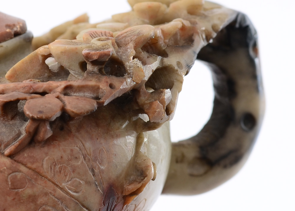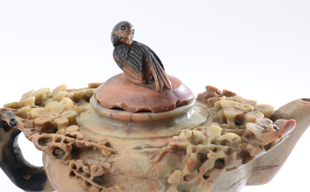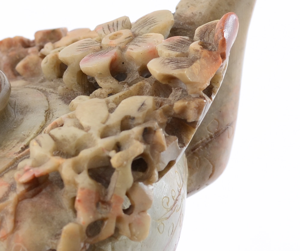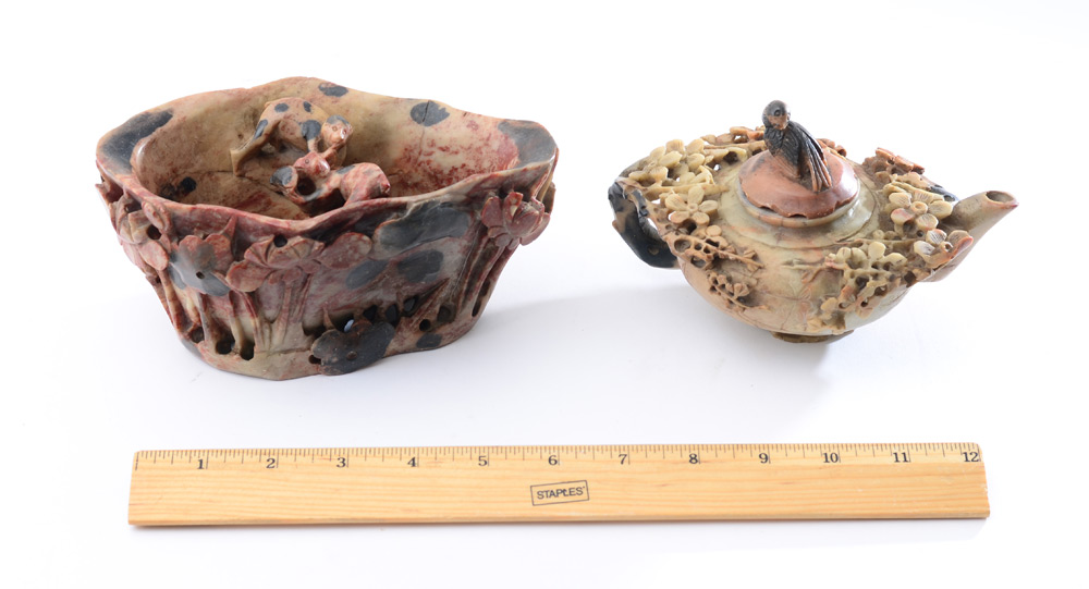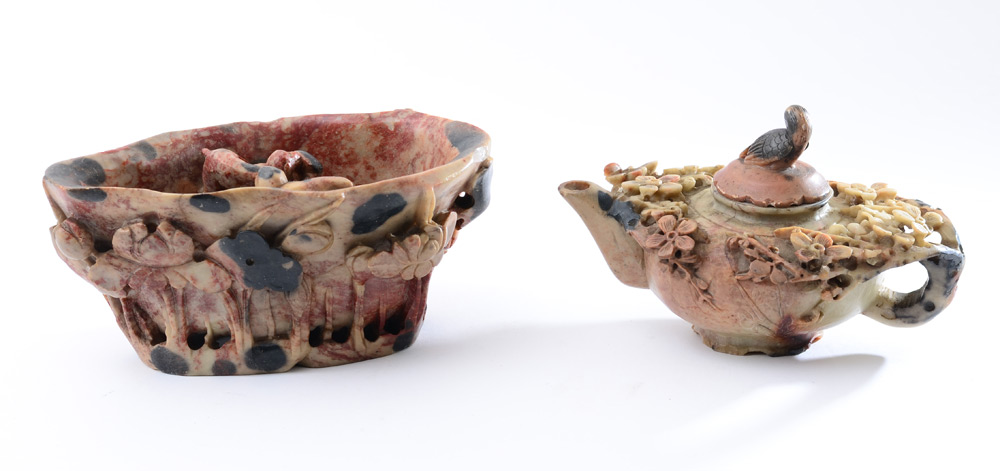 2 CARVED SOAPSTONE VESSELS: 2 pieces total to include 1) Teapot with floral decoration, lid with bird finial, signed on base. 3 3/4'' h. x 6 1/4'' x 4 1/4''. 2) Libation cup with carved figures interior, floral decoration exterior, signed on base. 3 1/4'' h. x 7'' x 4 1/4''.