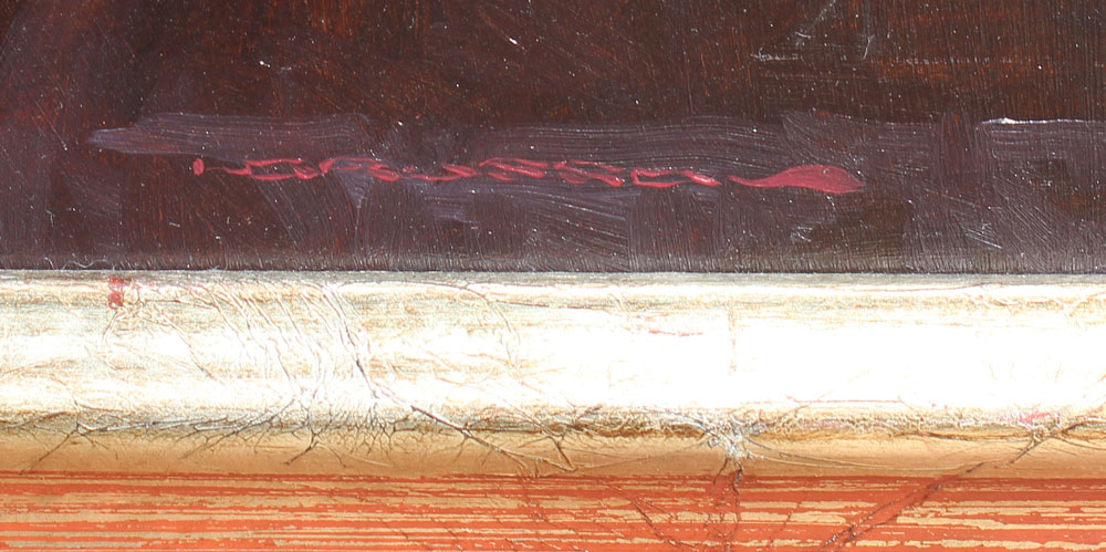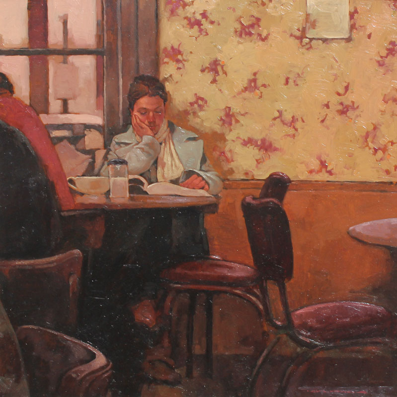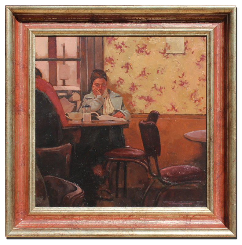 LORUSSO, Joseph, (American, 1966-): ''At The Cafe'', Oil/Board, 20'' x 20'', signed lower right, custom painted and gilded frame, 25 1/2'' x 25 1/2'', Meyer Gallery label affixed verso. Original Meyer Gallery receipt for $3,400.00, along with articles about the artist from Focus/Santa Fe 2001, Southwestern Art October, 2001, and American Artist, February, 1999.