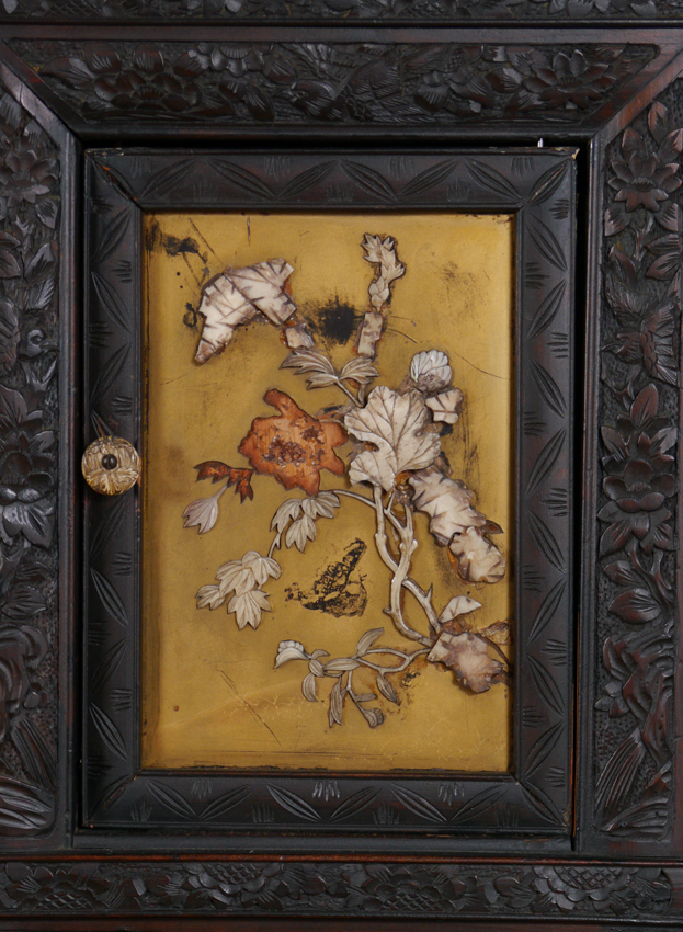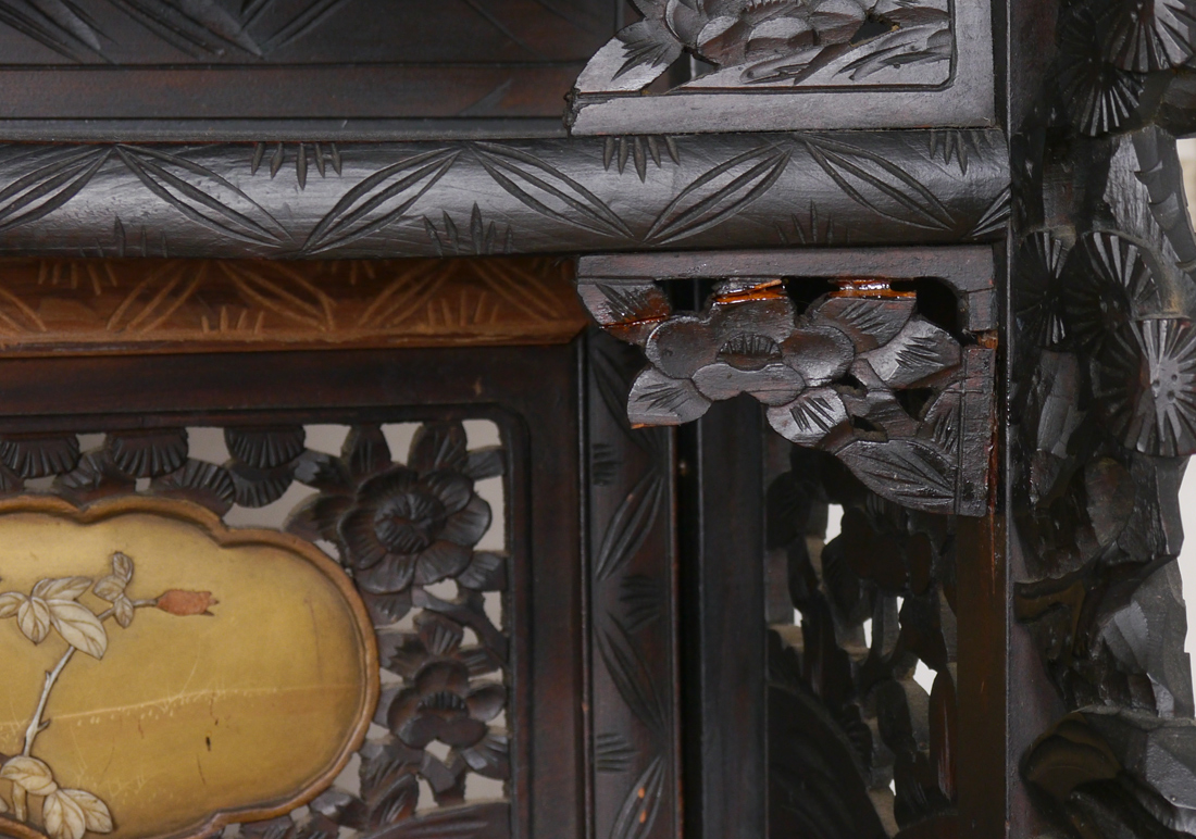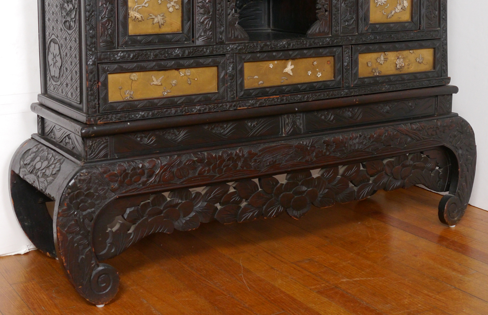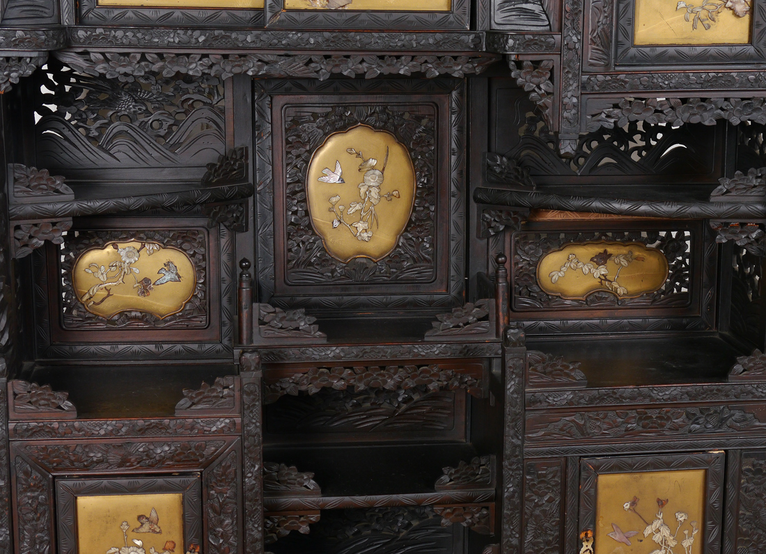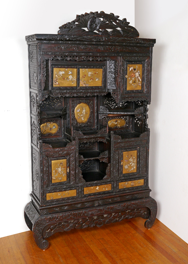 PROFUSELY CARVED ORIENTAL CABINET ETAGERE: Bird of paradise crest, inset panels on back, door and drawer fronts with applied mother of pearl and bone decoration. Sliding doors, 3 regular doors, 3 drawers and open storage shelves, all on carved base with shaped scroll legs. Overall measures 77 3/4'' h. x 48'' x 14 1/2''.