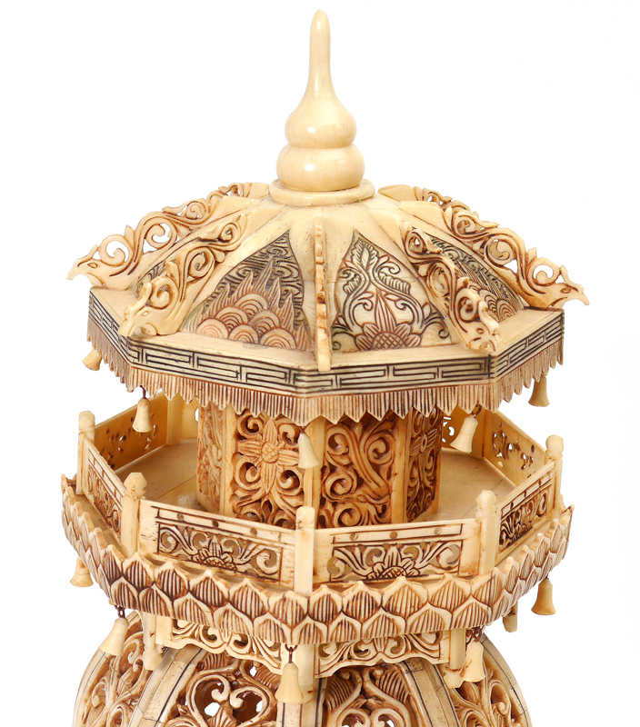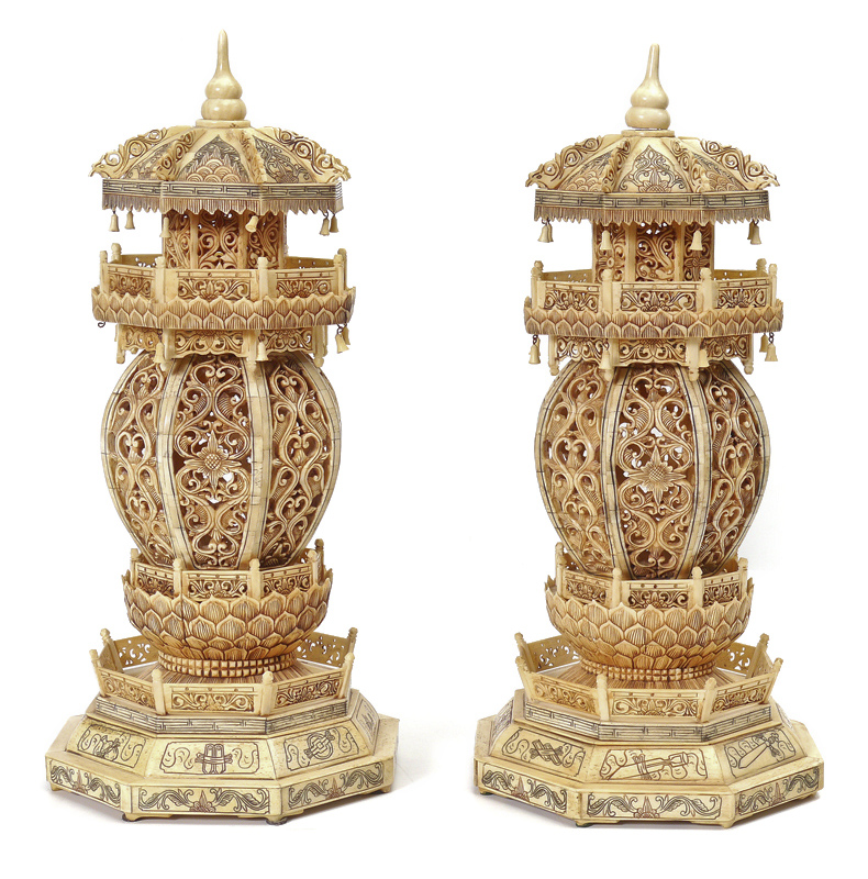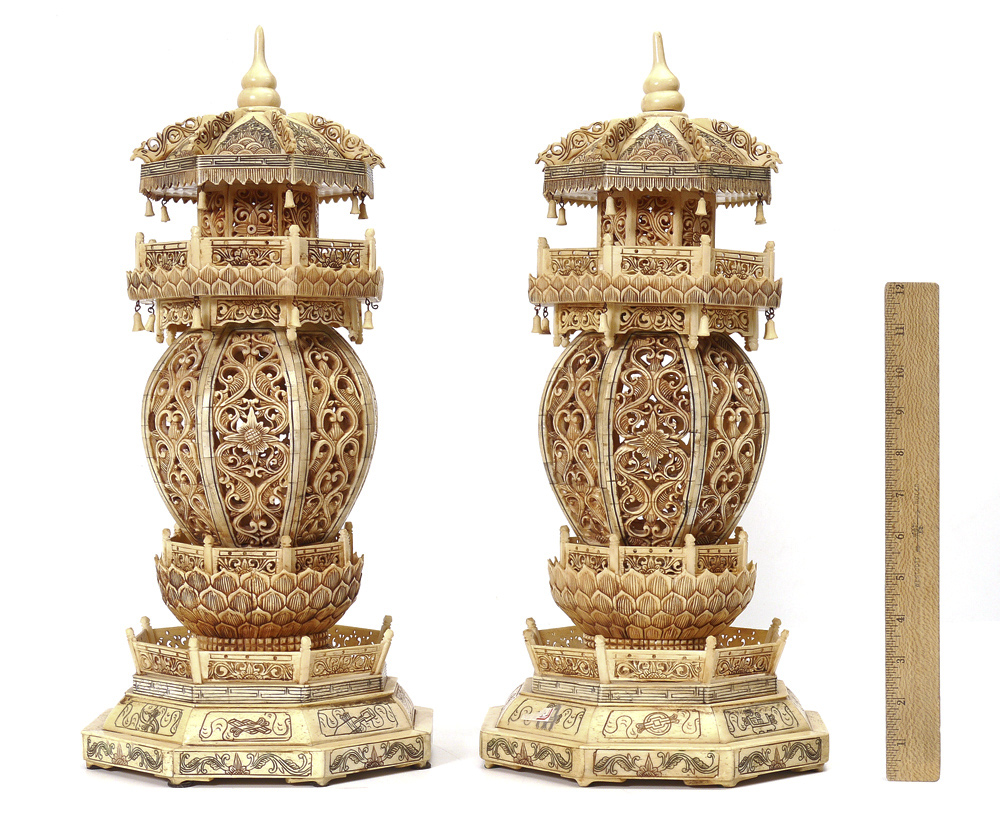 PAIR BONE CLAD CHINESE PAGODAS: Pierce carved and scrimshaw figural pagodas on lotus blossom, octagonal base. No visible signature or makers mark, approx. 18 1/4'' h. x 8 3/4''.