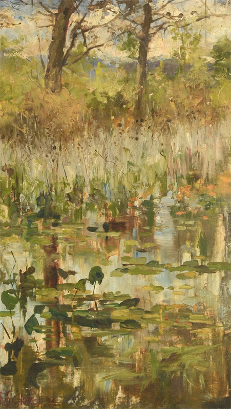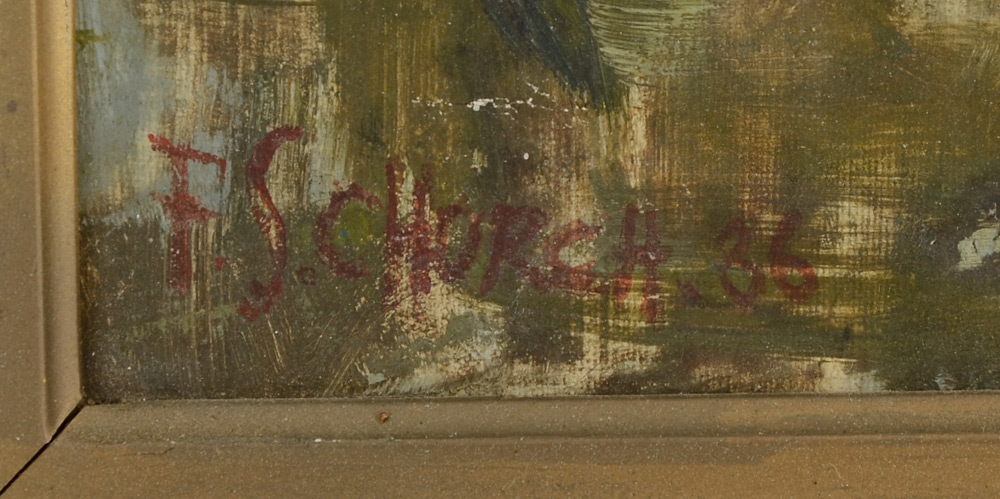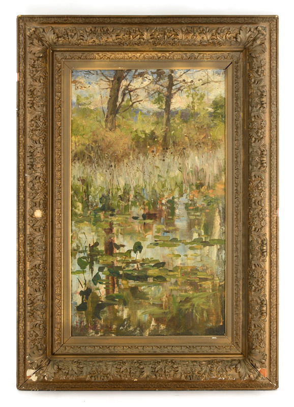 IMPRESSIONIST MARSH PAINTING SIGNED F.S. CHURCH: Oil/Canvas/Board, 26 1/2'' x 15 3/4'', signed lower left, dated '86, encased in an elaborate relief carved and gilded gesso frame 36'' x 25 1/2''.
