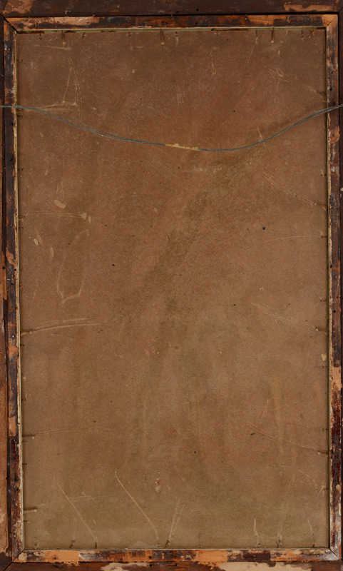 CONDITION: Several abrasions with minor loss, several minute chips, several spots where the canvas is lifting a little, only detectable by touch or very close inspection, needs cleaning, frame has had some repair and is in need of gesso replacement and re-gilding.