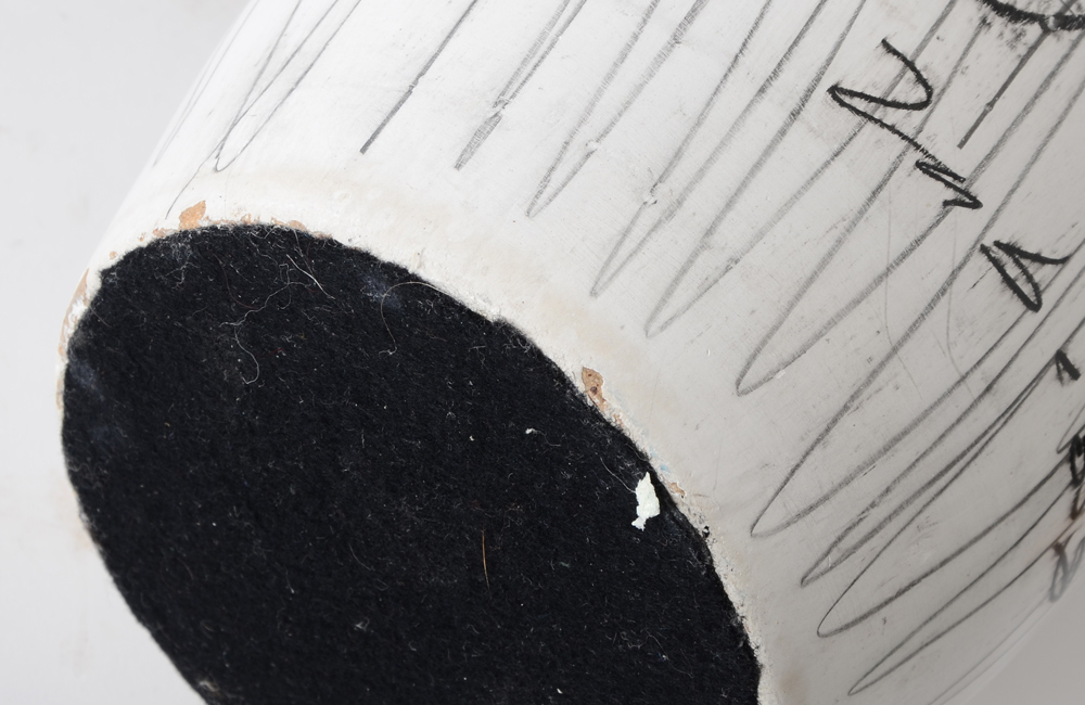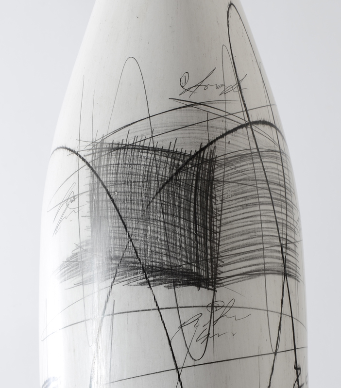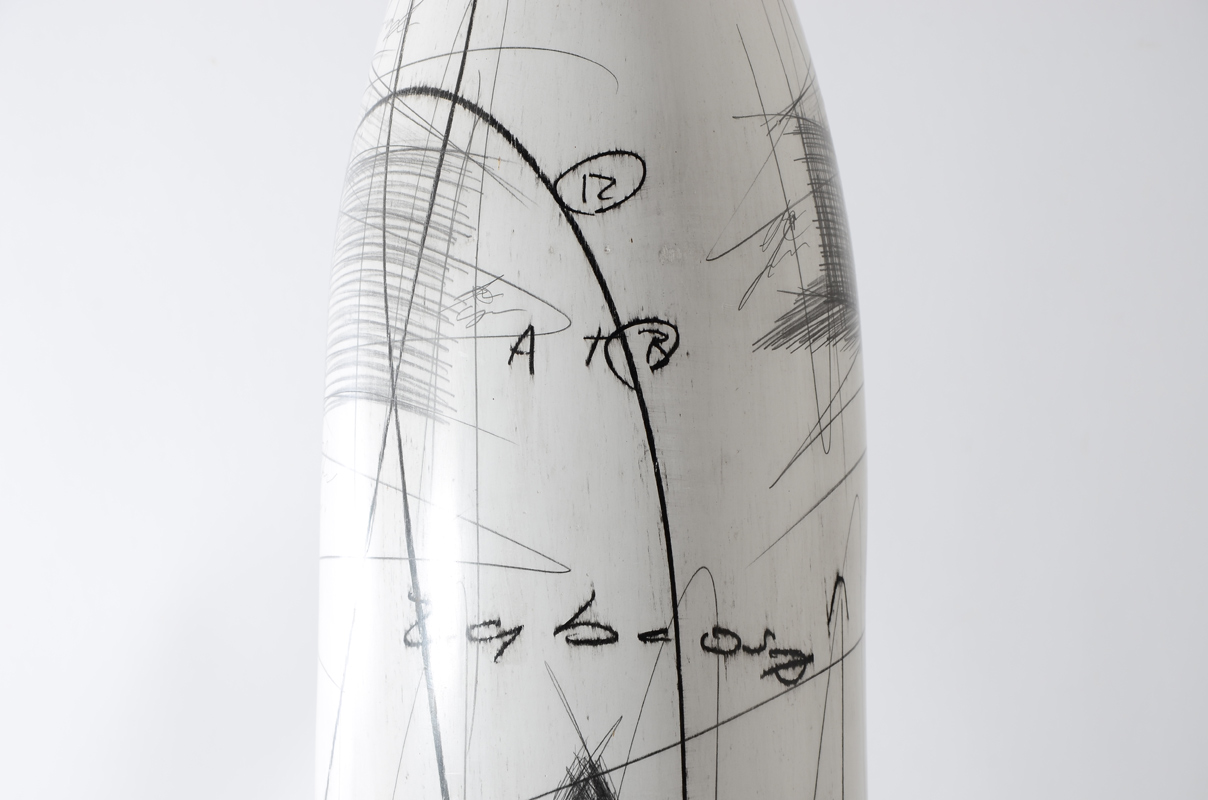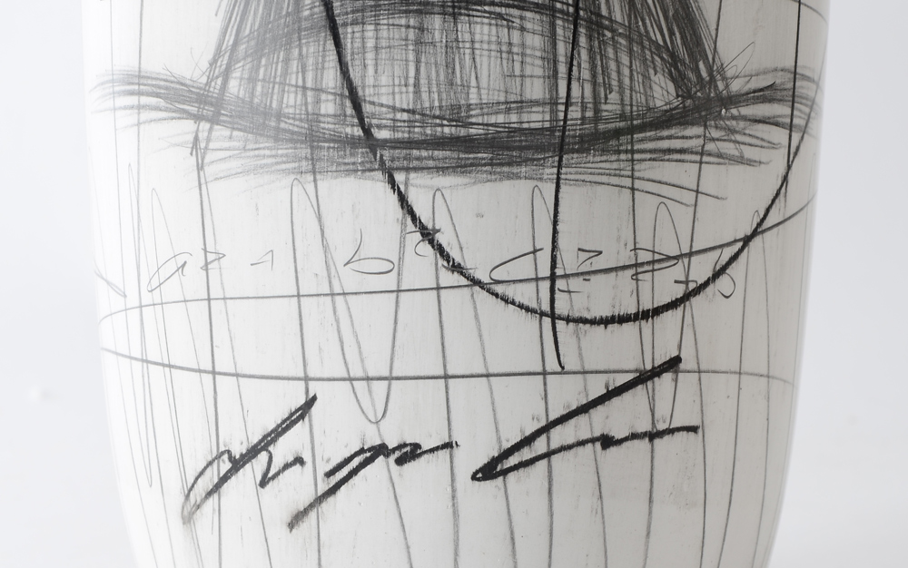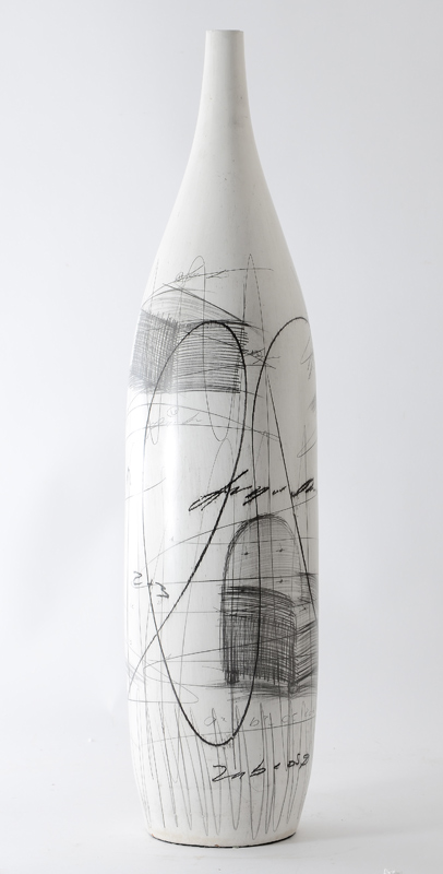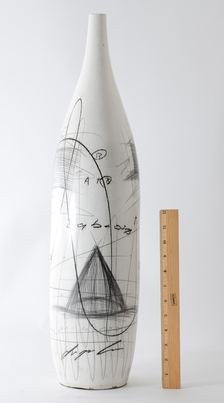MID CENTURY MODERN WHITE POTTERY VASE: White ground with various artist sketches of shapes and a chair with mathematical equations motif. No visible mark. 25 1/4'' h. x 6''.