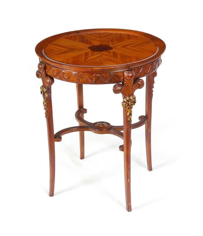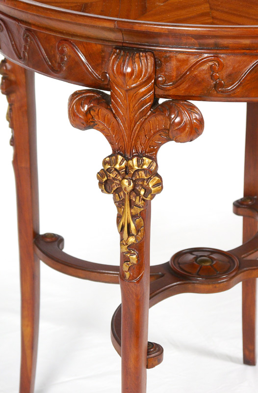 PARQUETRY INLAID CARVED SIDE TABLE: Parquetry inlaid top, carved skirt, top of legs carved with fleur de lis and garland, tapered legs, shaped stretcher. Overall measures 29 1/2'' h. x 24''