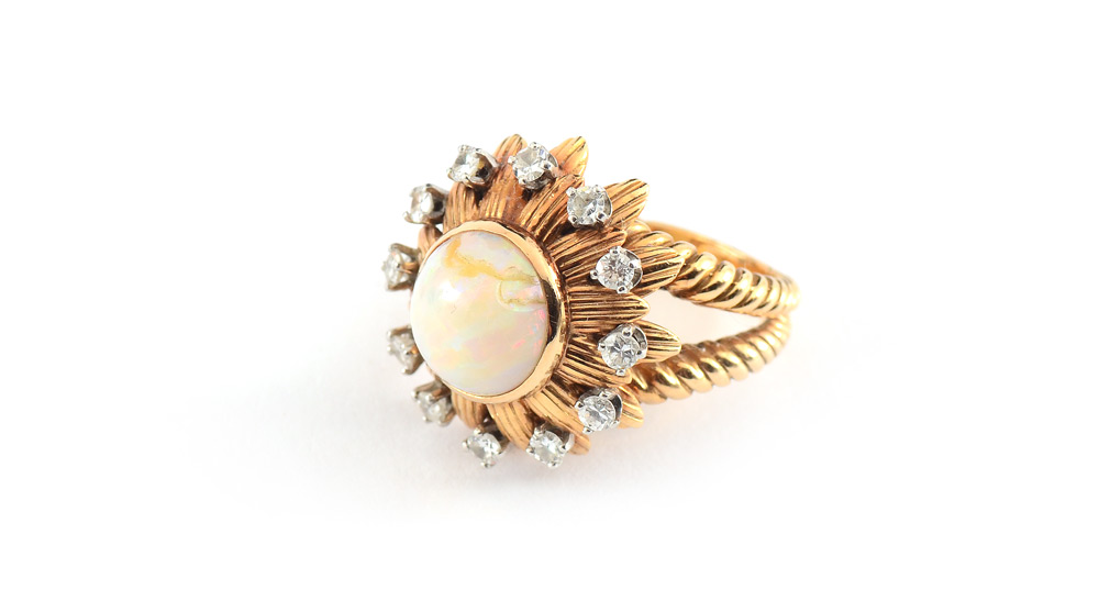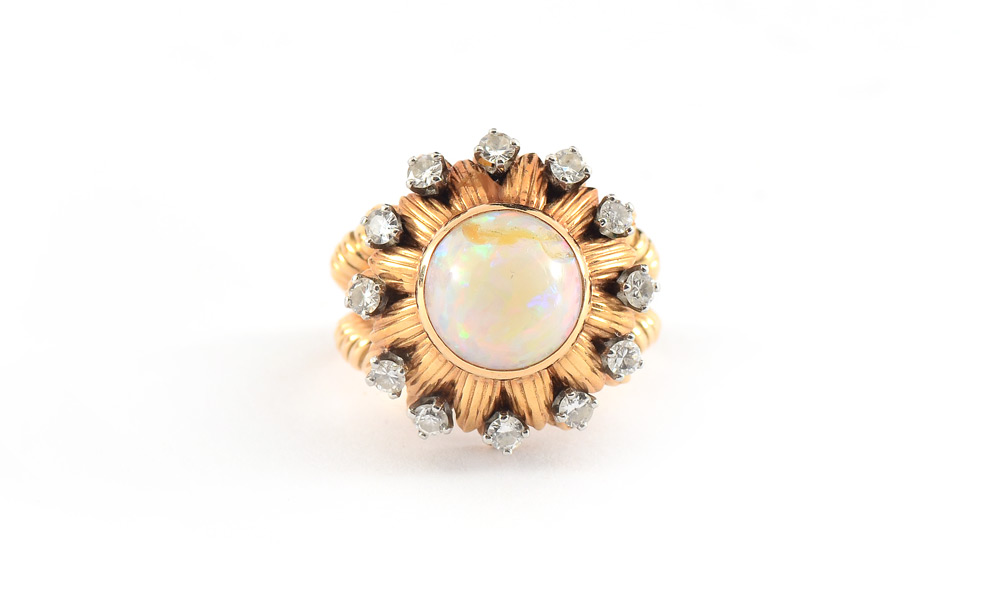18K OPAL & DIAMOND RING: 18k yellow gold ring centering a 10mm, cabochon opal framed by 12 Swiss cut diamonds totaling approx. .50. Size 5. Weight 15 grams.