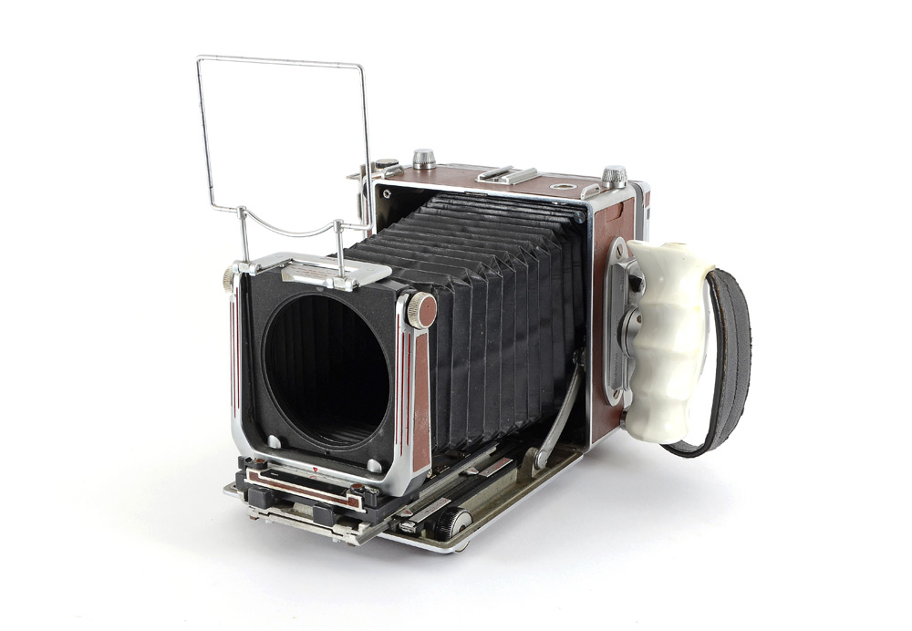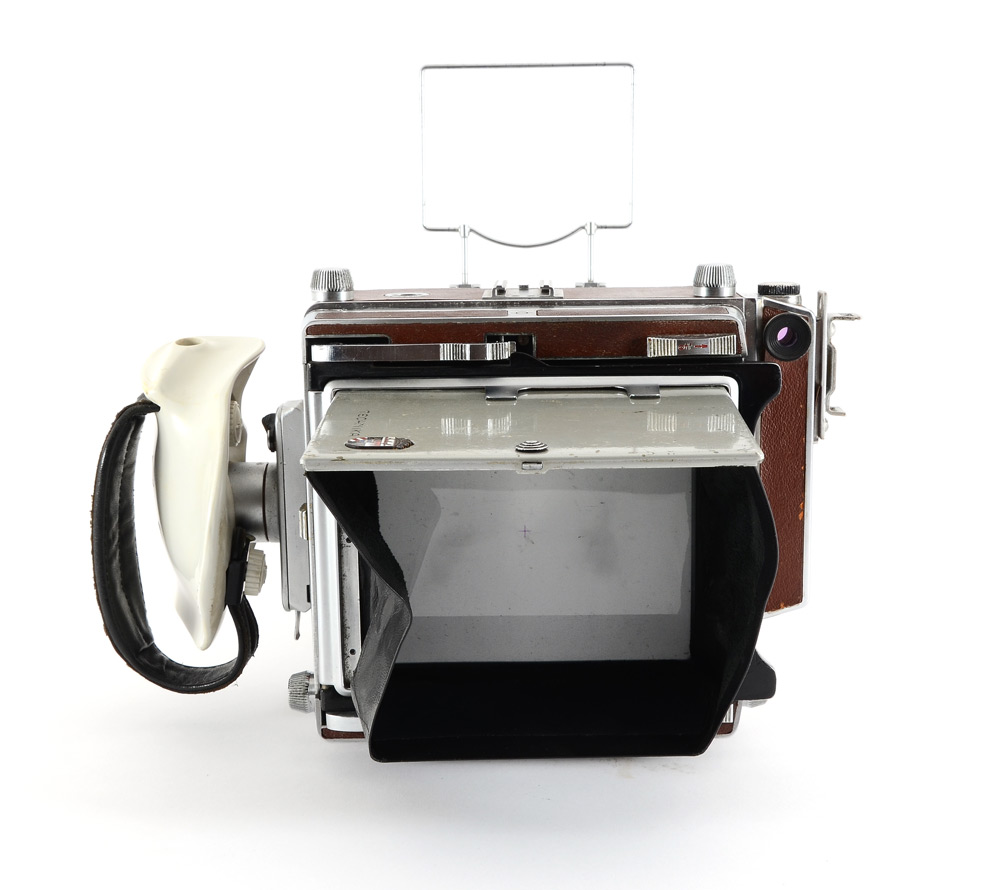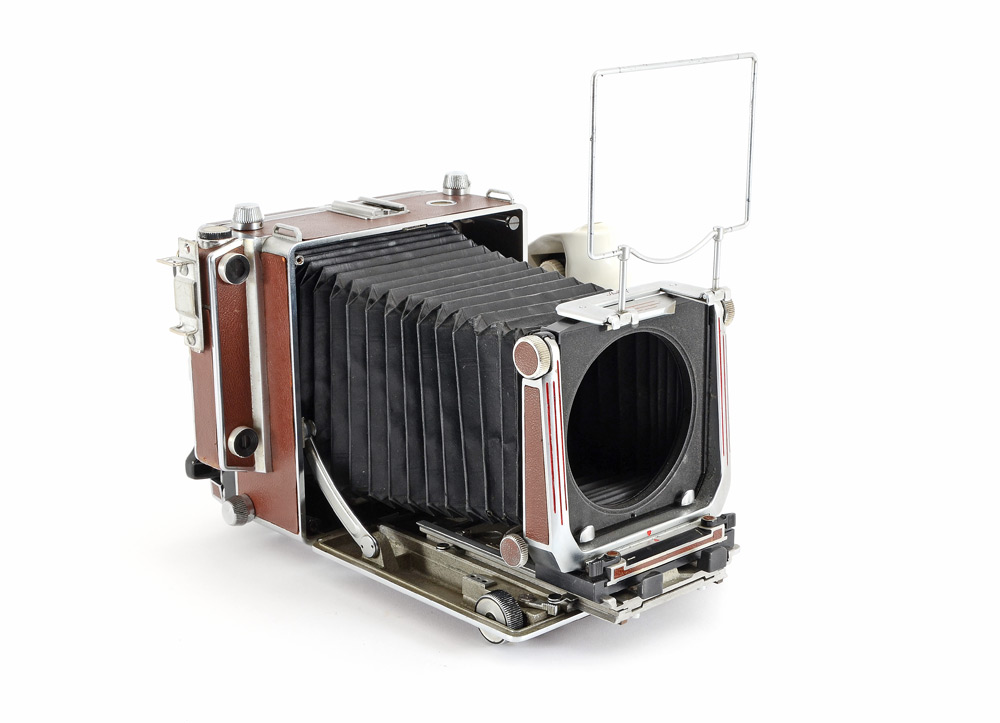 CONDITION: Functionality not tested. Bellows have several pin-prick tears where it creases; ground glass back has some hazing. Some areas of metal have pitting. Small areas of leather have slightly lifted from body. Rangefinder appears clear. Focus rail system appears to function smoothly.
