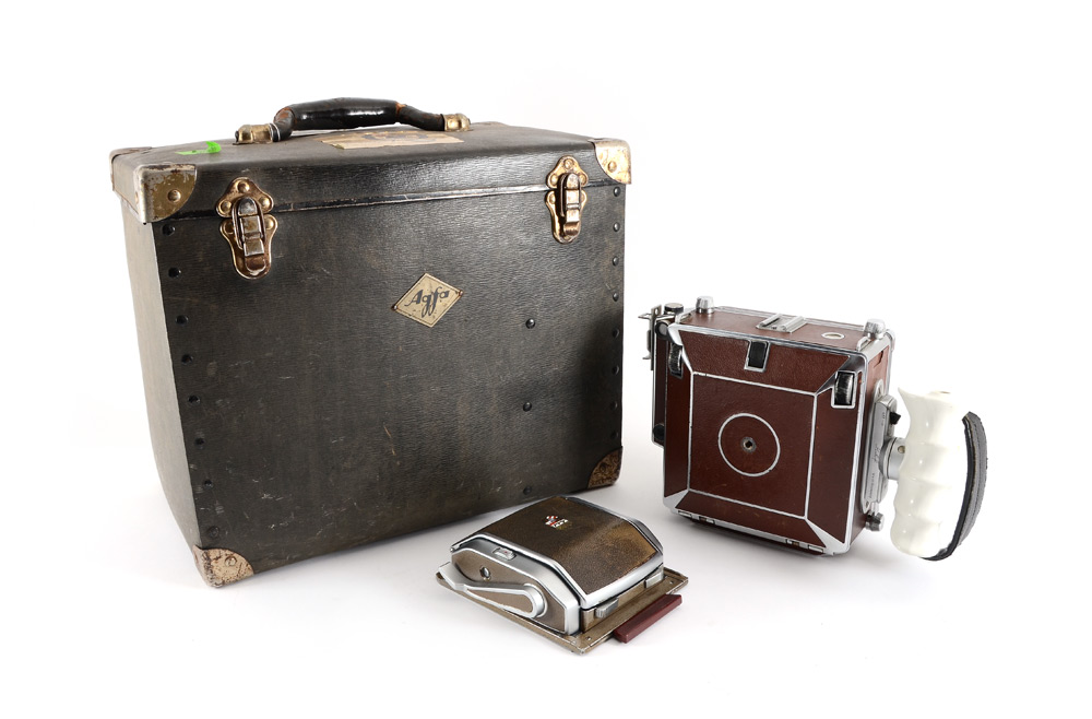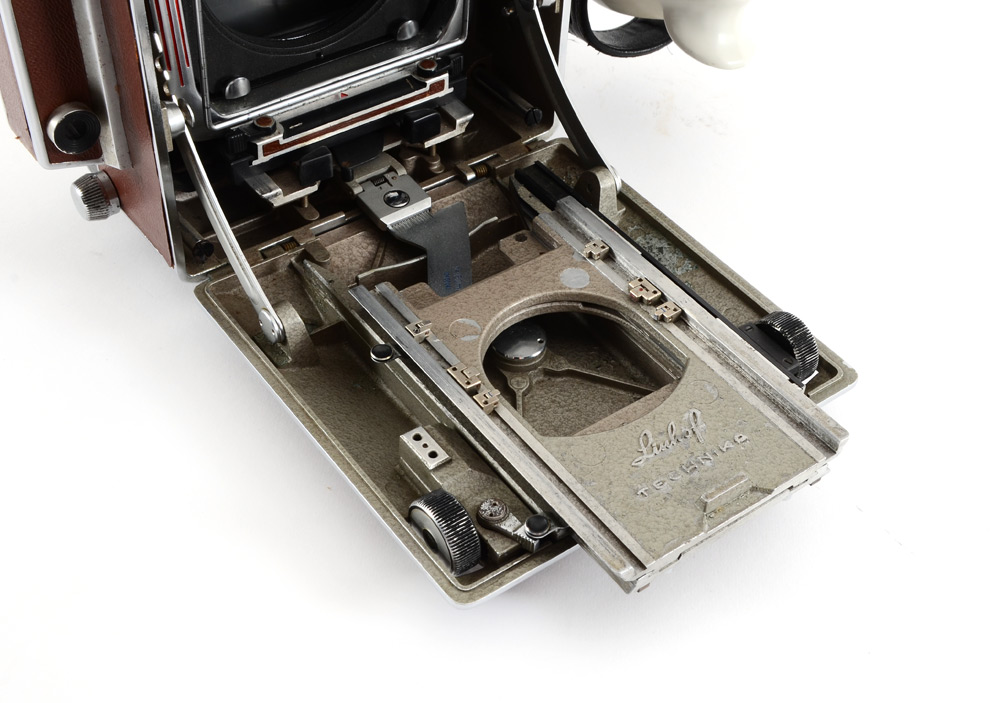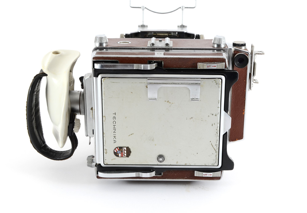 LINHOF TECHNIKA 4X5 LARGE FORMAT CAMERA: Includes a Linhof 56 X 72mm additional rollfilm holder. Camera is equipped with a rangefinder and left handed add-on grip. Lower Serial # of 63321. Large storage box included.
