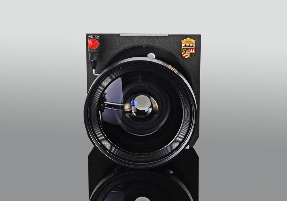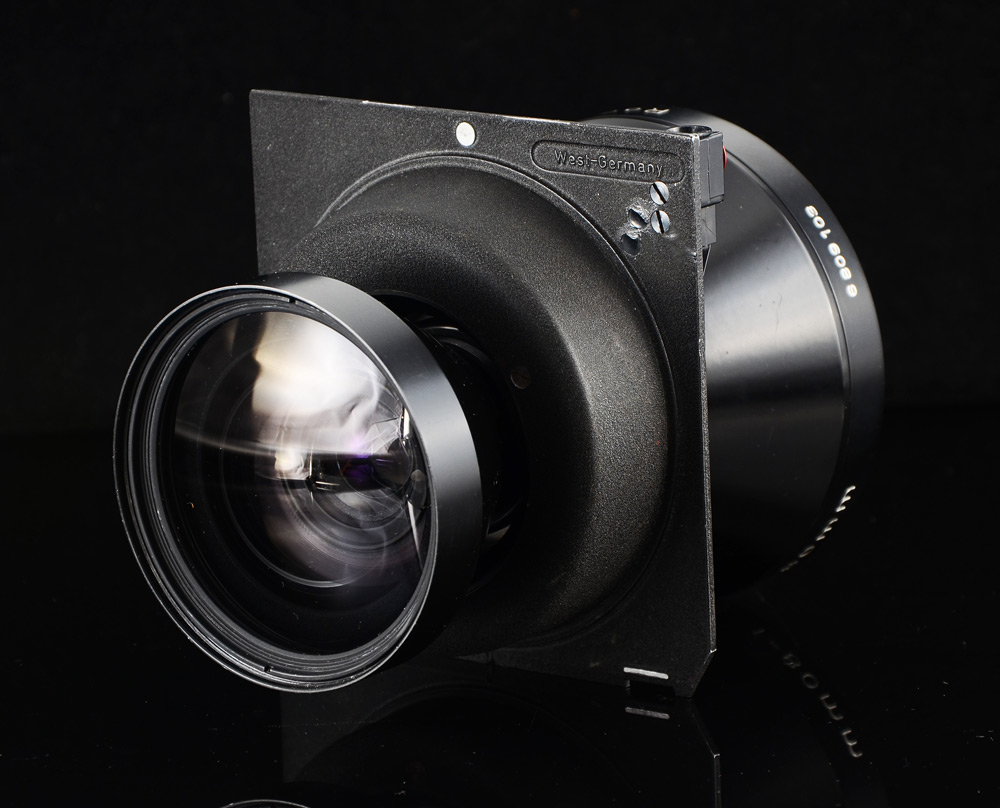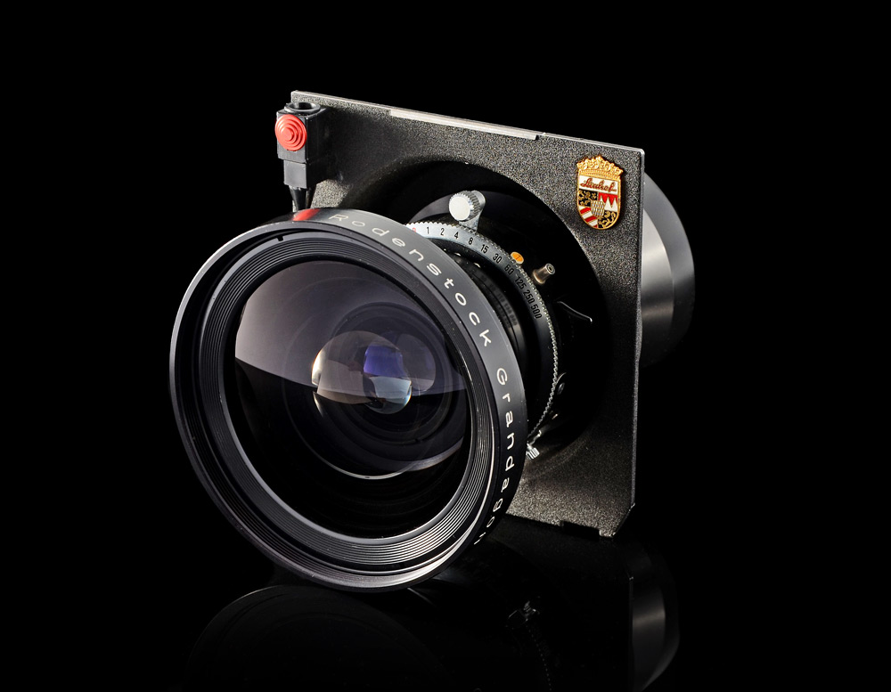 RODENSTOCK GRANDAGON 80MM F5.6 4x5 LENS: Mounted on a Linhof lens board w/ attached shutter release, coupled with a Copal No. 0 shutter. Lens appears to be at least single-coated. Serial # 6809103.