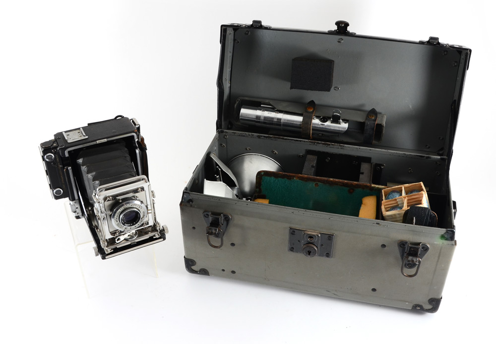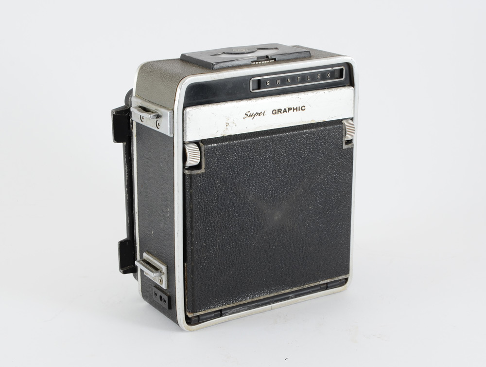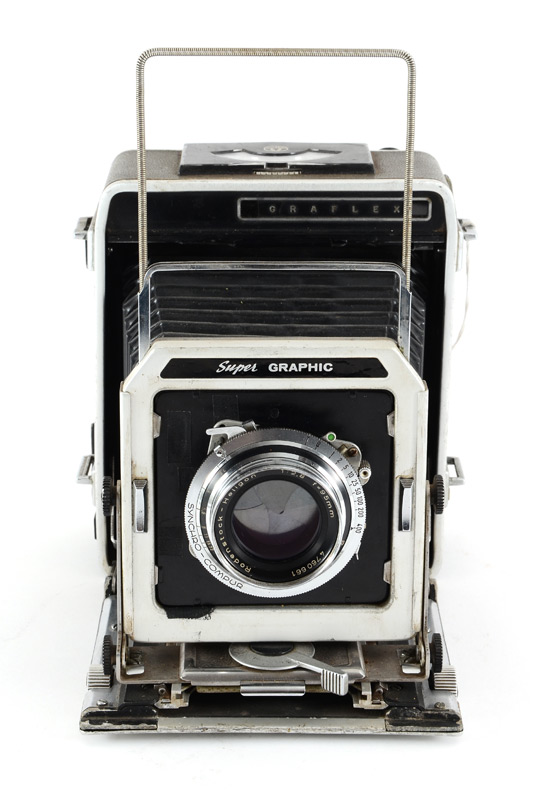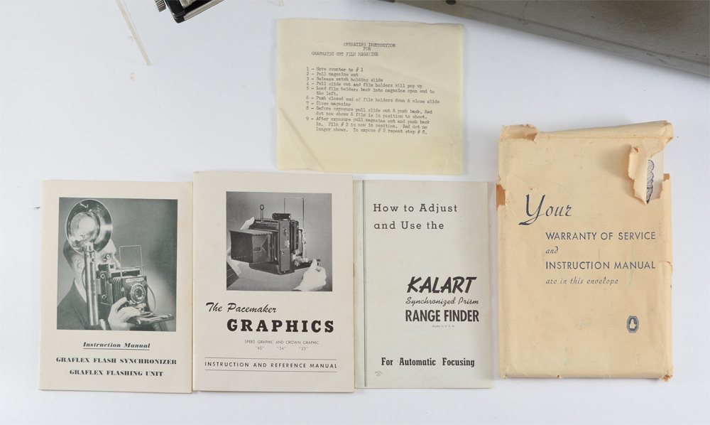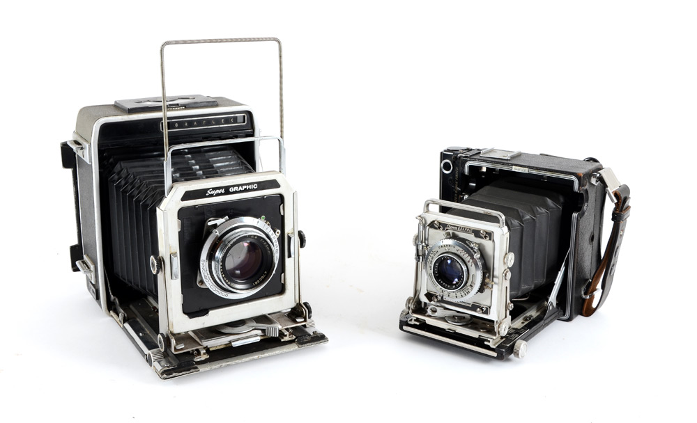 GRAFLEX LARGE FORMAT CAMERA LOT: To Include - 1) Graflex Crown Graphic Rangefinder Camera with attached Kalart Synchronized Rangefinder and Kodak Ektar 101mm F4.5 Lens. Included are several flash bulbs, an additional film holder, and an additional flash with two cones. Comes with original box and manuals. Dimensions of box are 17 1/2'' x 8 1/2'' x 9 1/2''. 2) Graflex Super Graphic camera with built in rangefinder. Included is a Rodenstock - Heligon 95mm F2.8 lens mounted on a Synchro Compur shutter.
