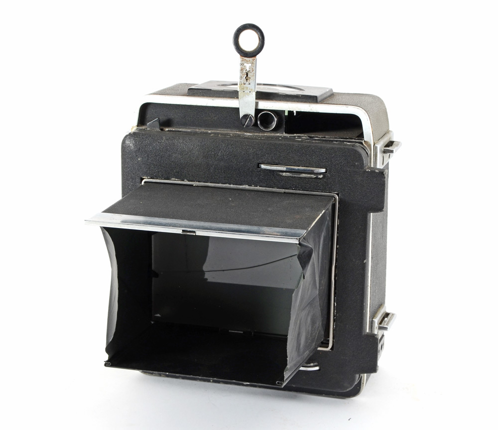CONDITION: 1) Exterior shows wear, camera appears to function as it should, however further functionality is not guaranteed. Lens could use cleaning. 2) Bellows are in good shape. Lens shutter not accurate at slower speeds, cracked focusing screen. Exterior of camera body shows years of active use. Total functionality not guaranteed.