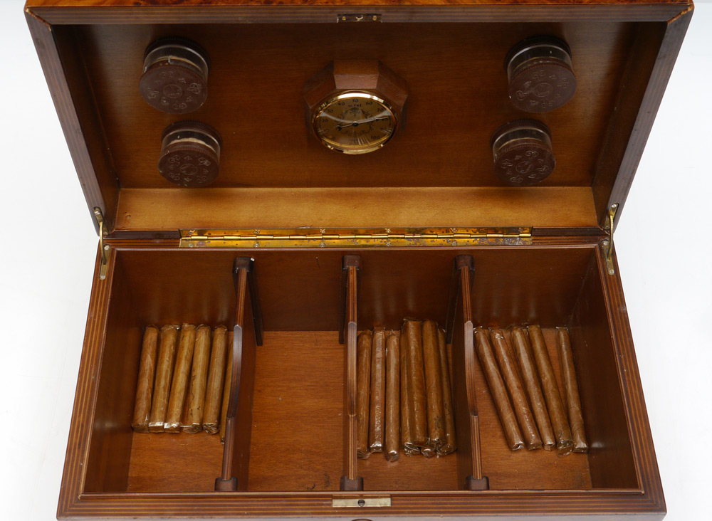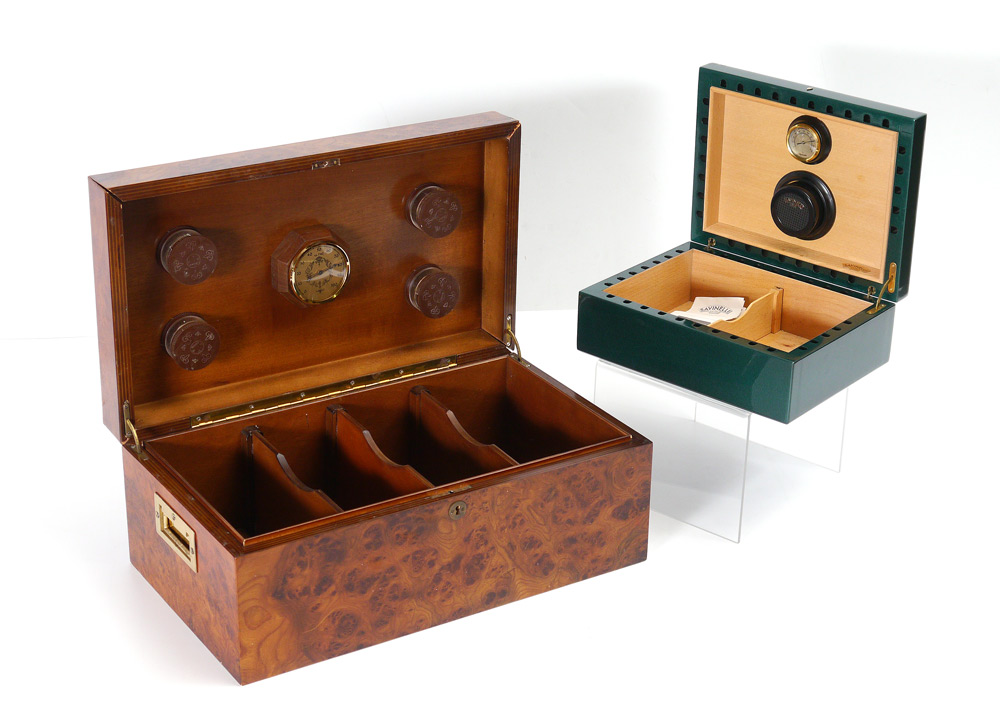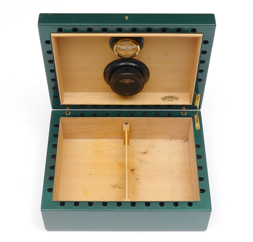 2 ITALIAN CIGAR HUMIDORS: 2 pieces total to include 1) Italian burl wood with hygrometer and 4 water pad inserts marked M. V. M. Firenze. 4 compartments for keeping cigars separate, brass handles. Overall measures 7 3/4'' h. x 18 3/4'' x 10 3/4''. 2) Green lacquer Savinelli with hygrometer, single insert, dual compartments for storage. Measures 4 1/4'' h. x 11'' x 8 1/2''.