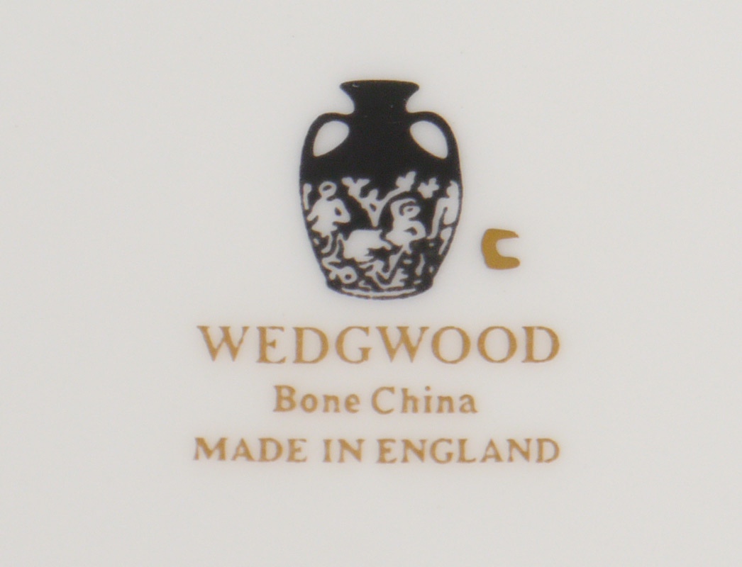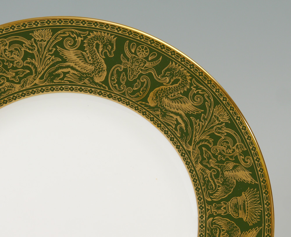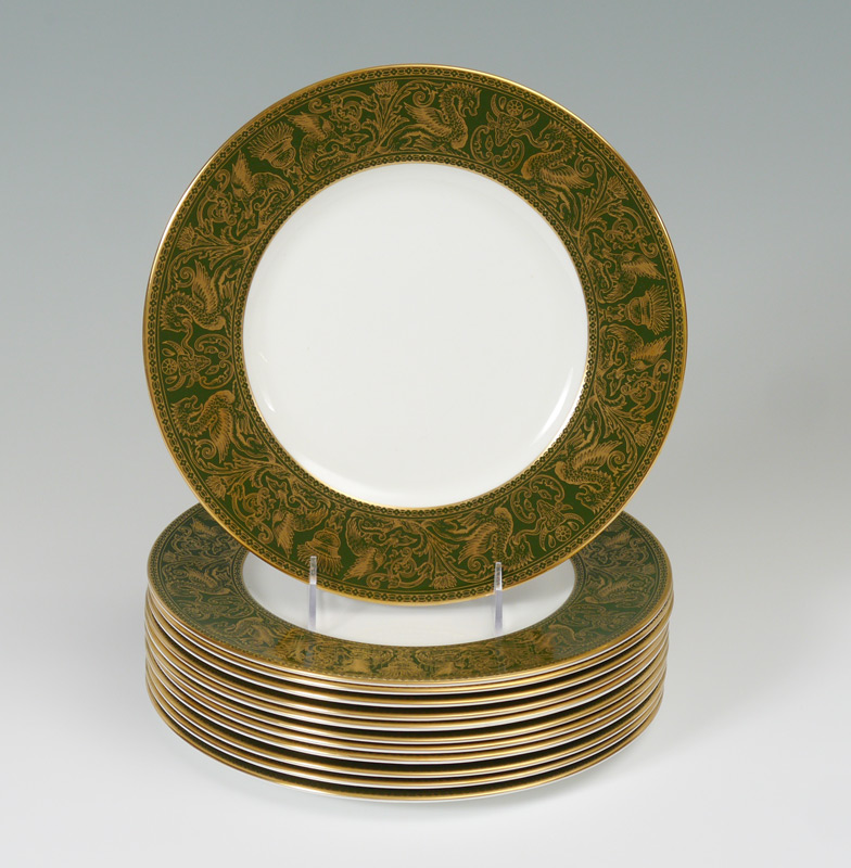 SET OF 12 WEDGWOOD FLORENTINE DINNER OR SERVICE PLATES: Gold on dark green border. 10 3/4'' dia.