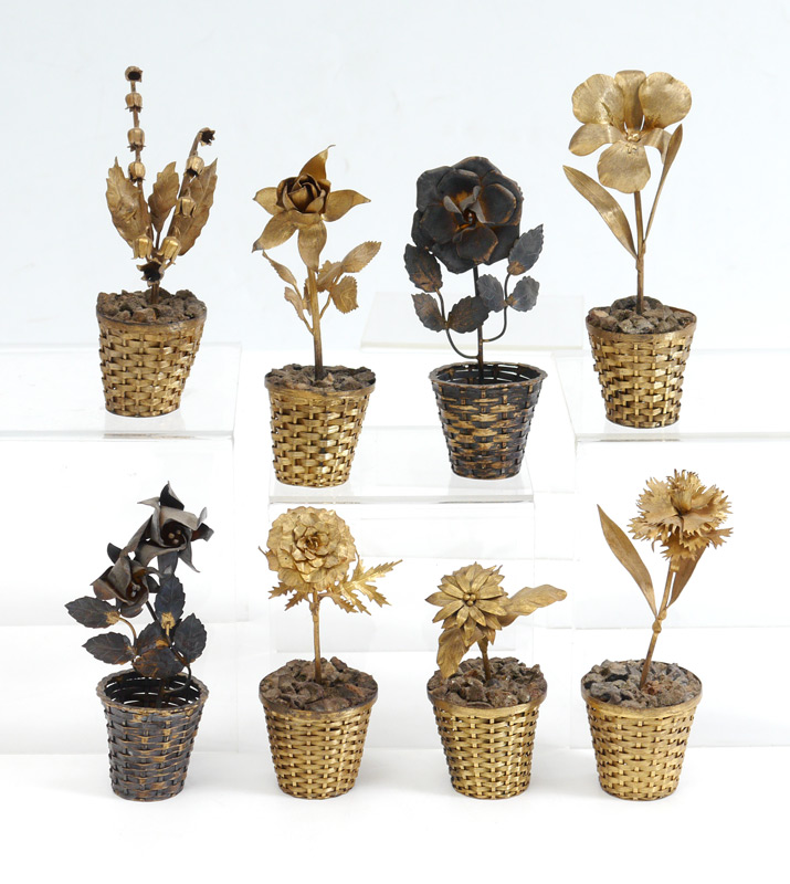 8 MEXICAN STERLING FLOWER MODELS: 6 marked with L.E.T. makers mark and 3 of those also marked ''Rancho Alegre''. Other 2 marked SH Taxco. Tallest measures 5 1/4'' h.