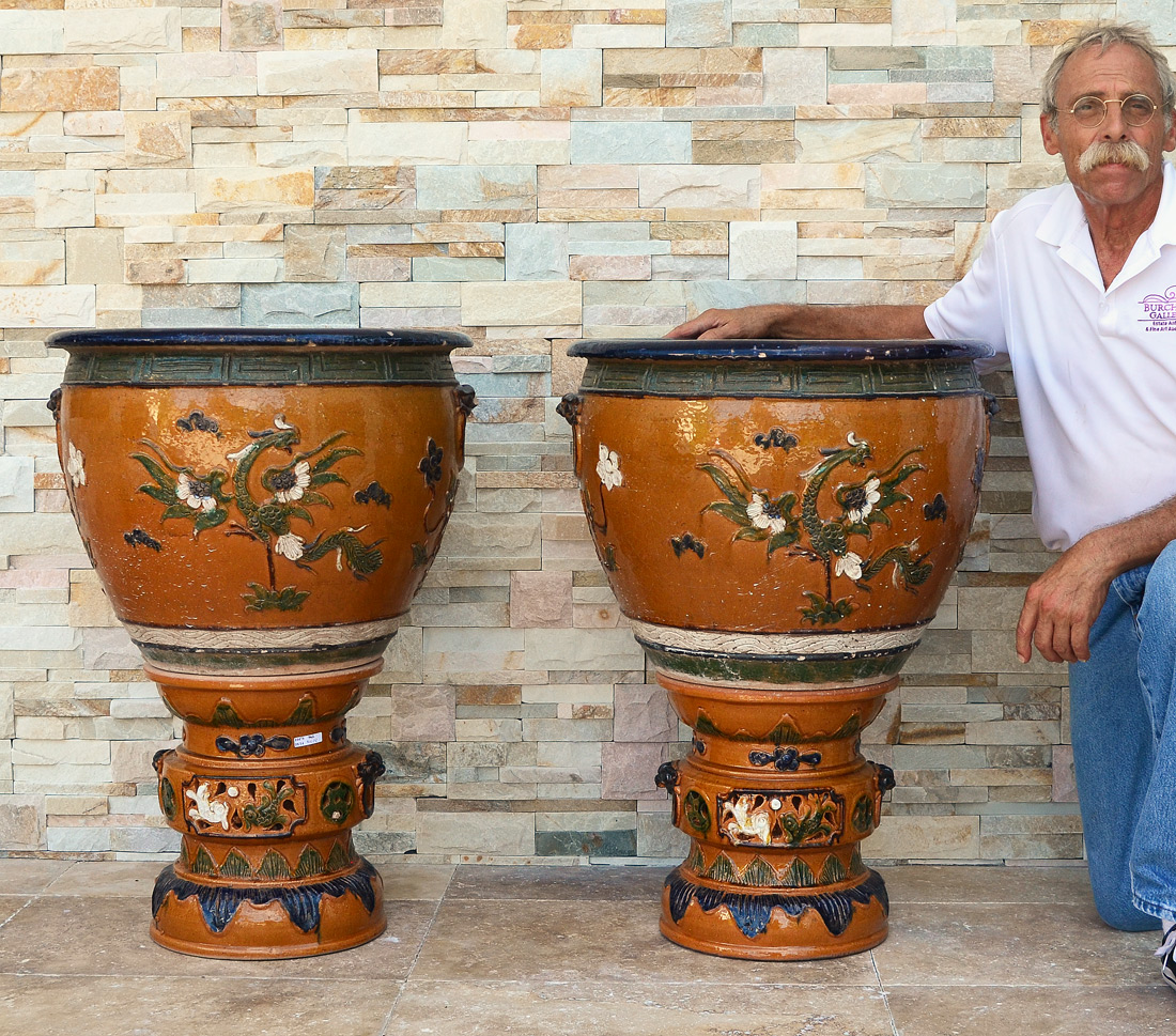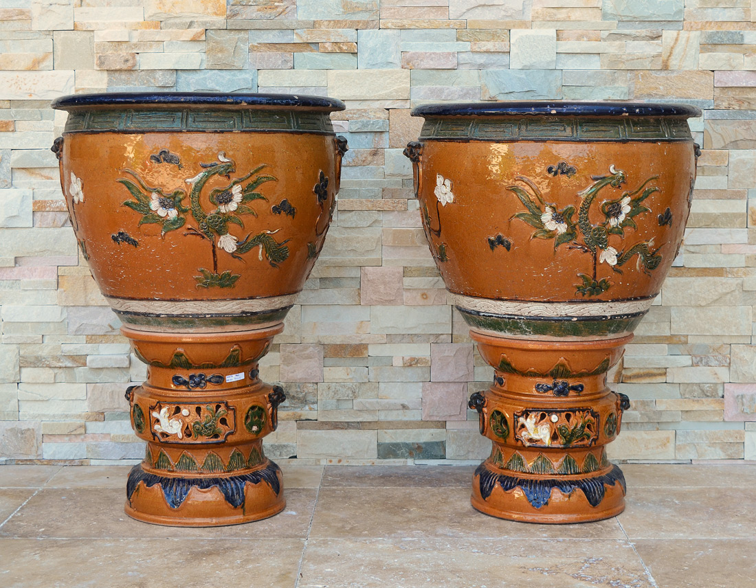 PAIR LARGE ORIENTAL JARDINIERE & PEDESTALS: 20th century production, terra cotta jardinieres with blue glass rims, applied figural birds and flowers, each measures 18''h. x 23'' dia. Bases measures 14 1/2''h. x 13 1/2''.
