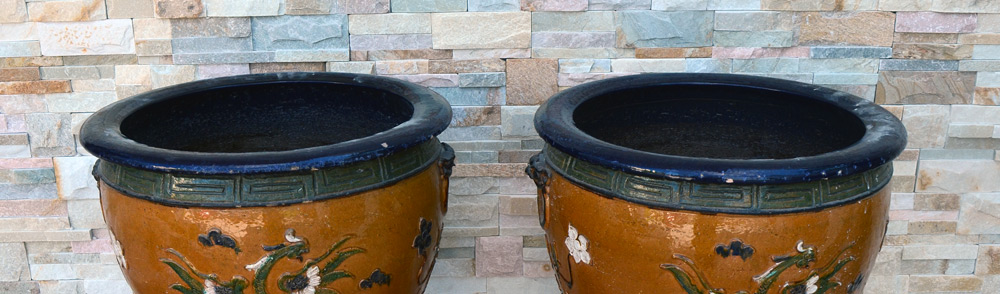 CONDITION: Chips and crazing to be expected, one larger chip to one jardiniere.