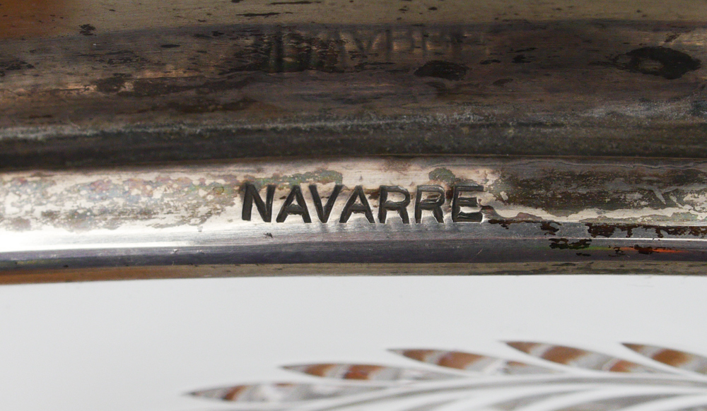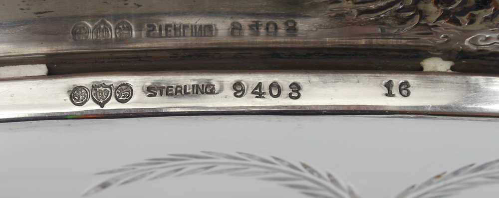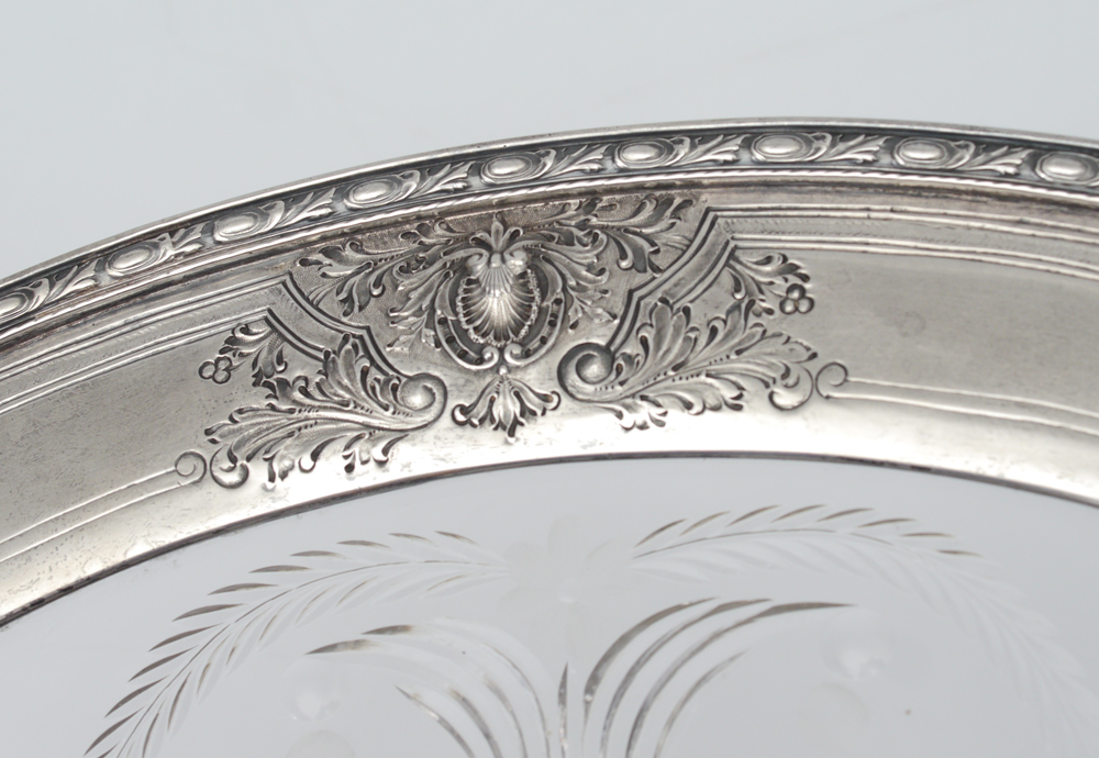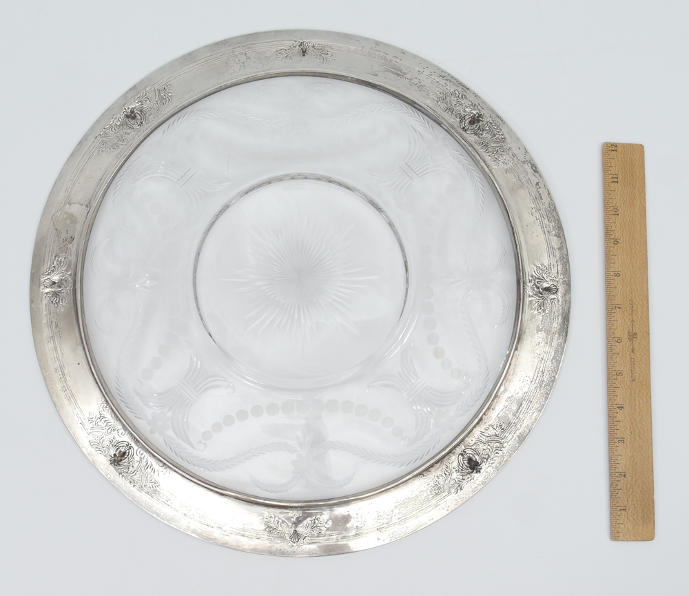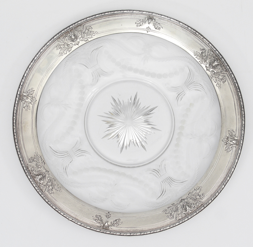 WATSON NAVARRE STERLING RIM CUT GLASS SERVING TRAY: Large round serving tray by Watson, cut glass center with starburst and swags, sterling rim with embossed decoration marked with Watson mark, Sterling, 94068, 16, Navarre. 16'' dia.