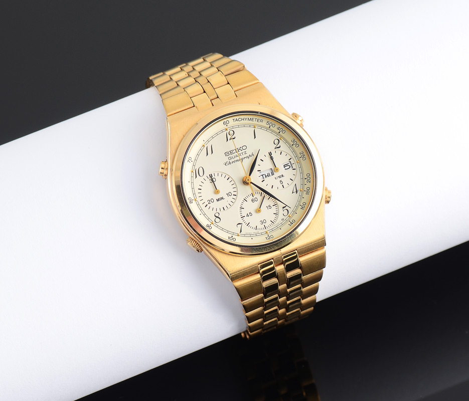SEIKO 7A38 CHRONOGRAPH WATCH: Analog quartz watch with chronometer. stop watch function and tachymeter. Gold tone with ivory dial. Sold in the original box with instructions and extra links.