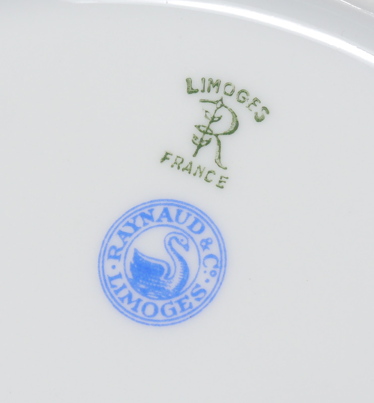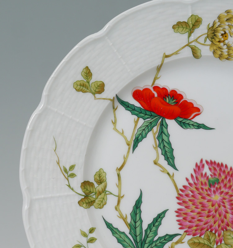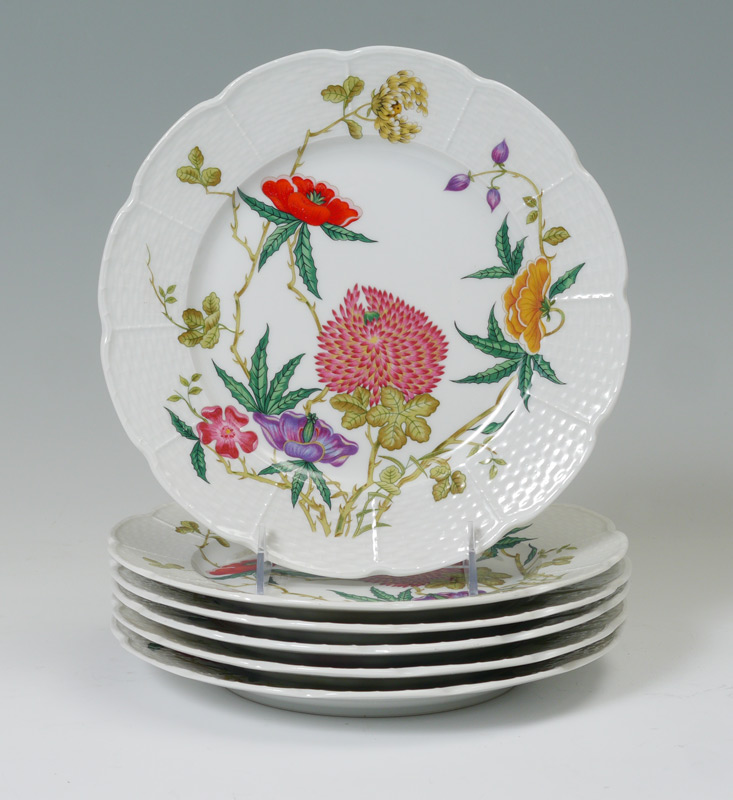 SET OF 6 FRENCH LIMOGES DINNER PLATES: White basket weave with vivid floral decor. 9 5/8'' dia.