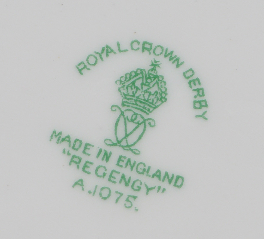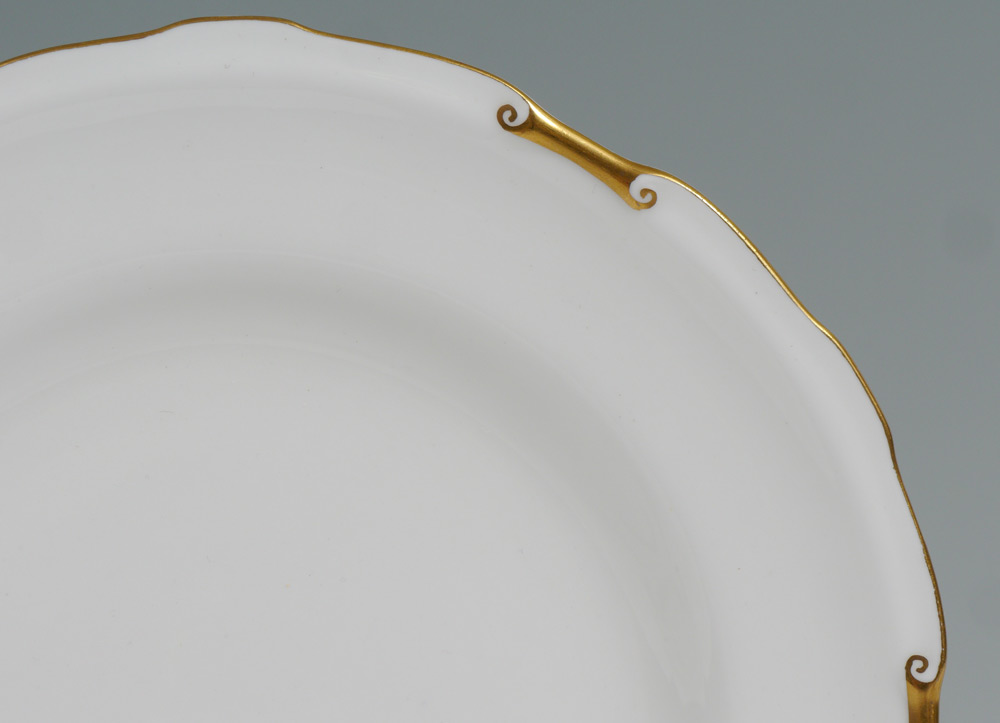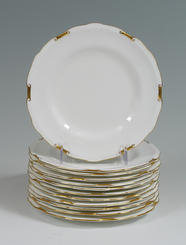 SET OF 12 ROYAL CROWN DERBY ''REGENCY'' PLATES: Salad or dessert plates, 8'' dia. Gold on white.