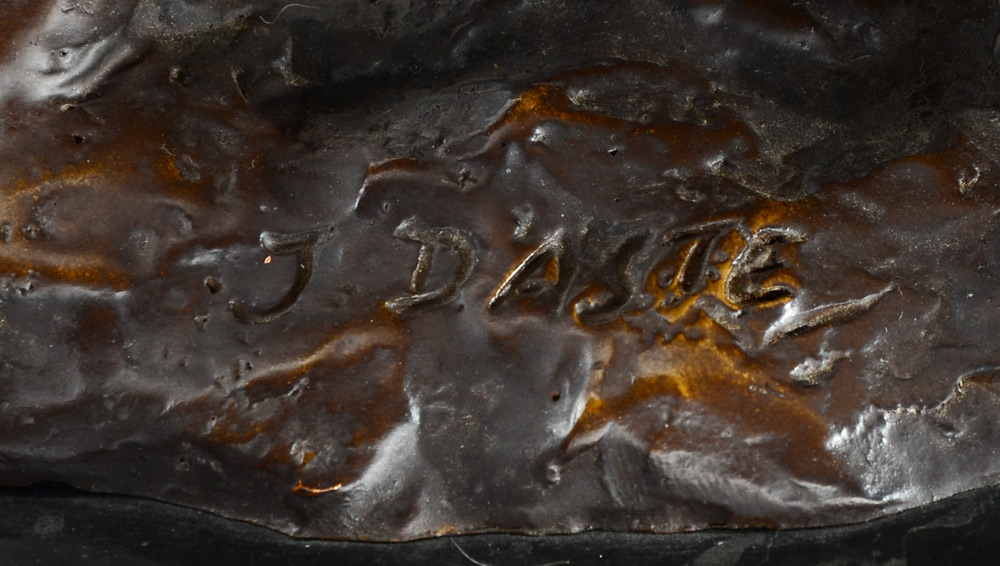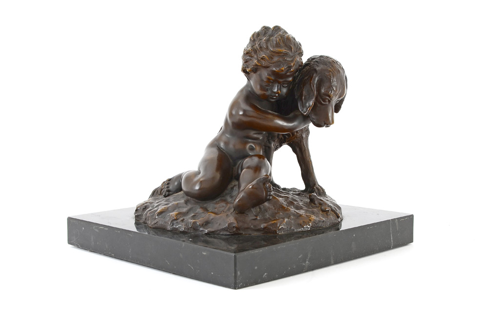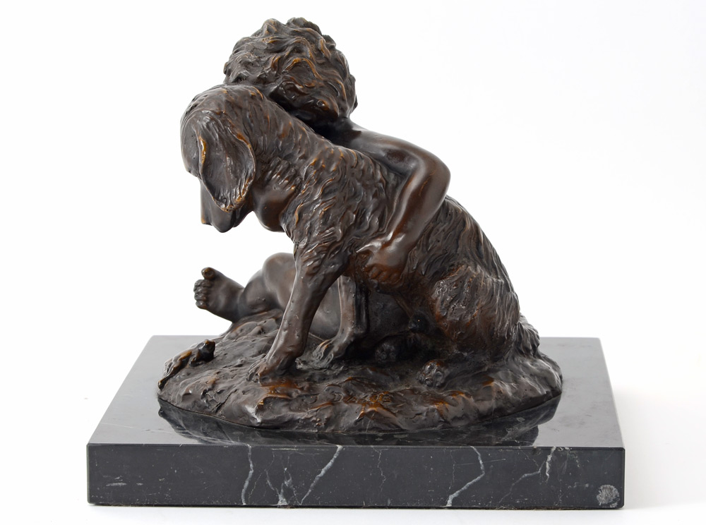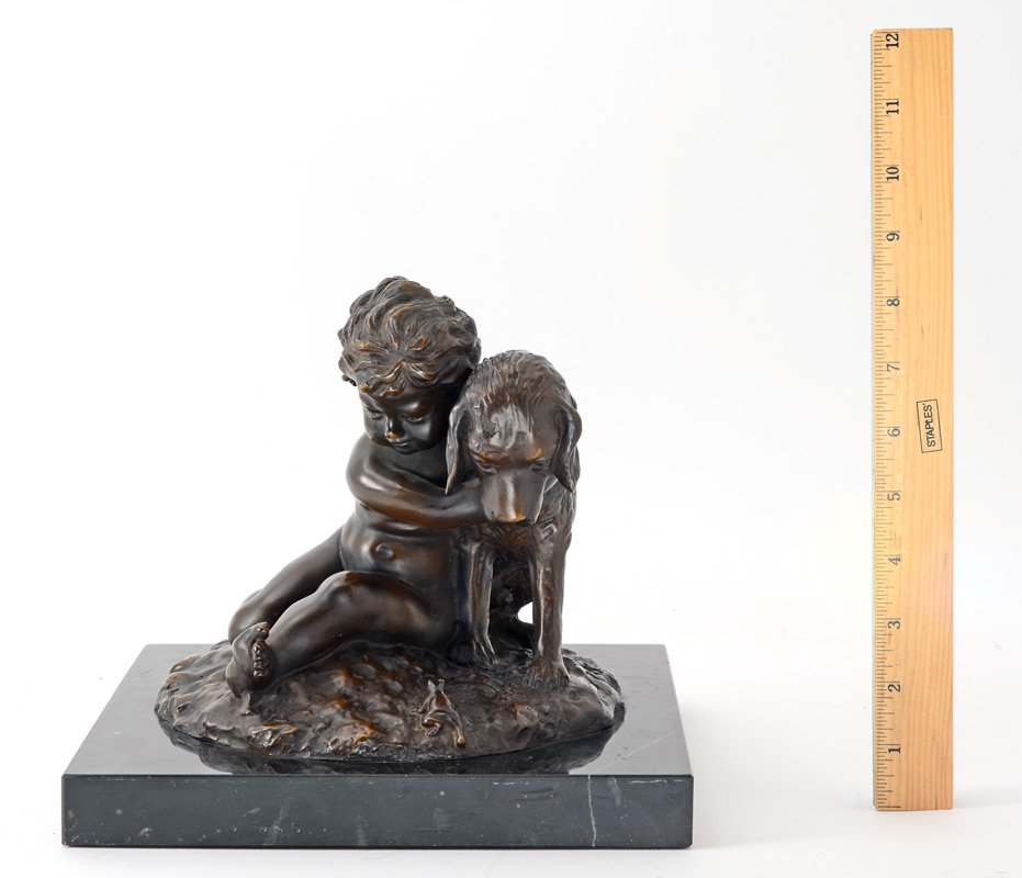 BRONZE SCULPTURE OF A YOUNG BOY & DOG SIGNED D'ASTE: 7'' h., affixed to a polished marble plinth, overall 8'' h.