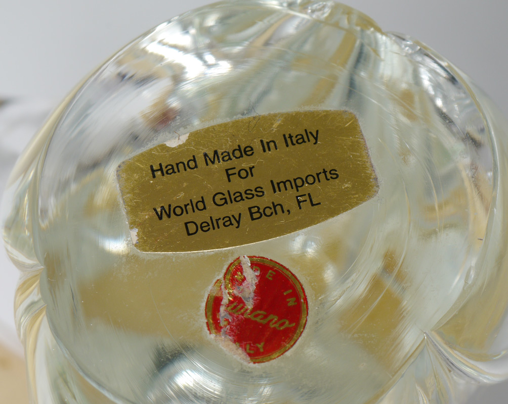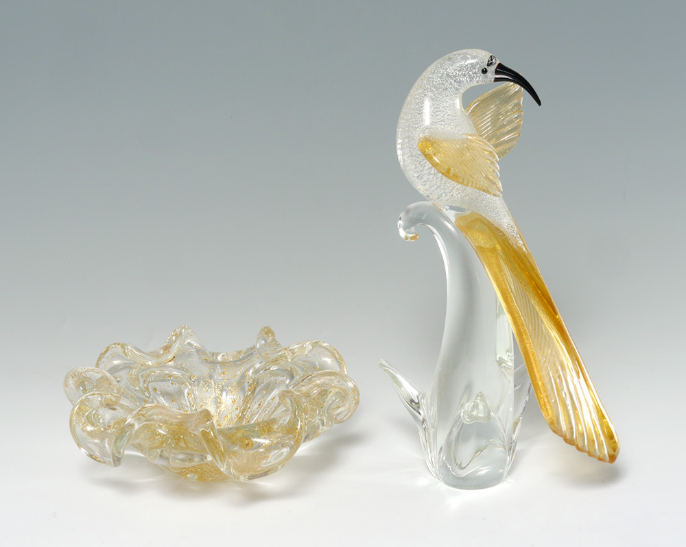 MURANO AVENTURINE ART GLASS BIRD & BOWL: 2 pieces total to include 1) Bird of paradise with aventurine wings and tail on clear foliate base, foil labels on base. 14 3/4'' h. x 9''. 2) Aventurine bowl with scalloped rim, foil label. 3 3/4'' h. x 10 1/4''.