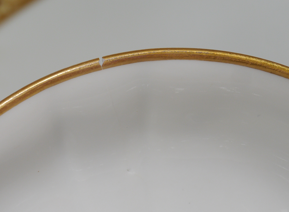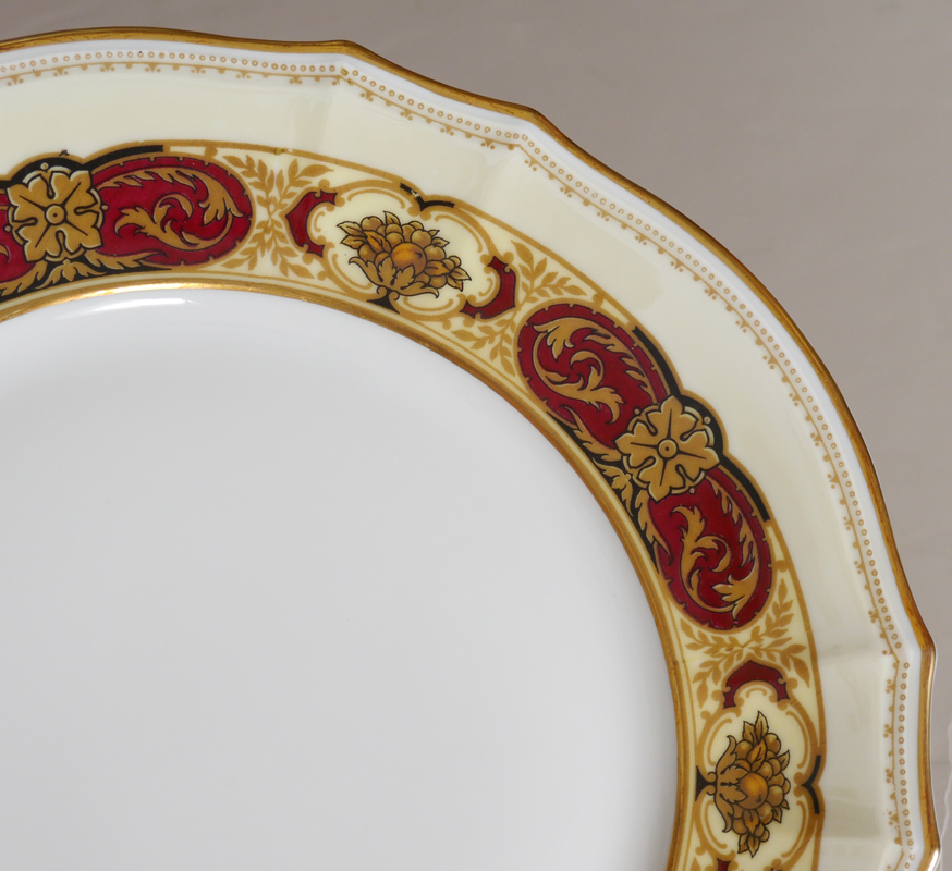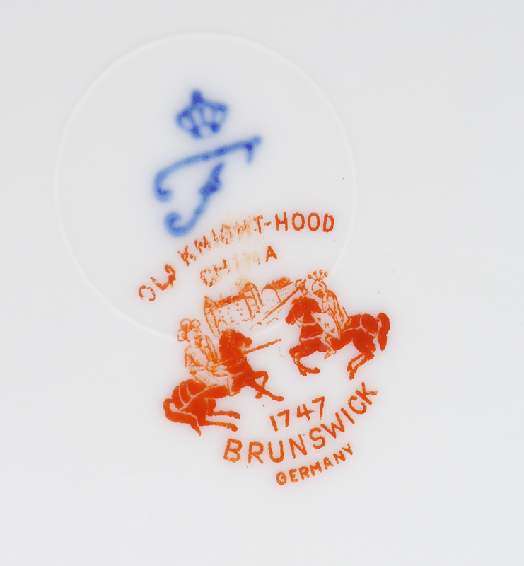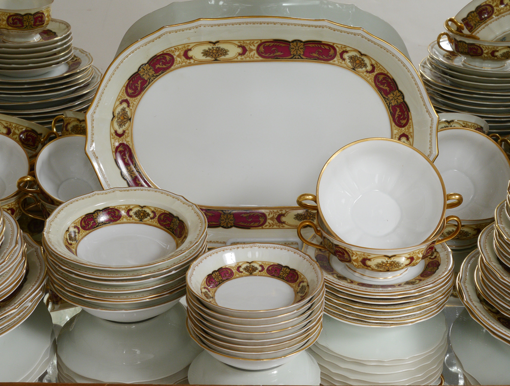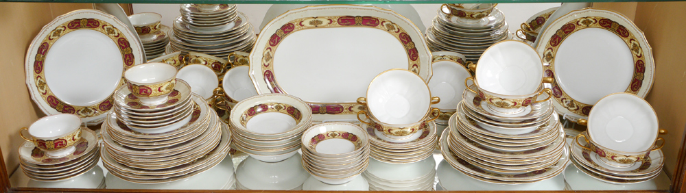 FURSTENBERG OLD KNIGHT-HOOD FINE CHINA IN THE BRUNSWICK PATTERN: Approx. 72 pieces to include 7 dinner plates (10''), 10 luncheon plates, 6 salad plates, 7 soup bowls, 7 bread plates, 10 cream soup bowls with 6 saucers, 8 cups with 12 saucers, 8 dessert bowls, and the 15 1/4'' platter.